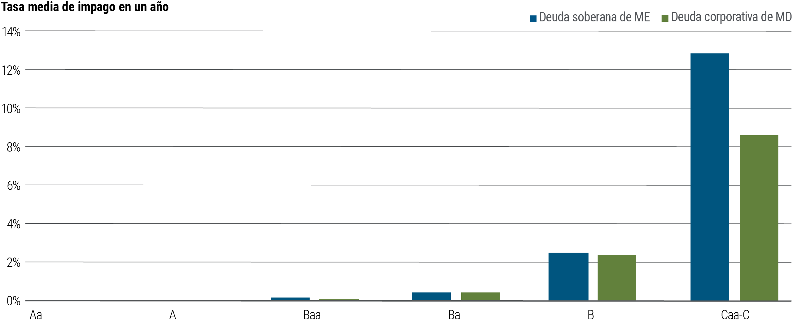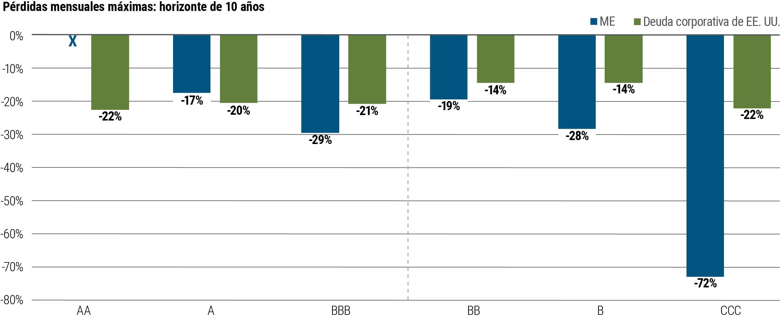 El riesgo crediticio fundamental también es similar. Los incumplimientos en gran parte del espectro de calidad de las calificaciones crediticias, desde AA hasta B, están en línea con los emisores corporativos estadounidenses (ver la gráfica 3).