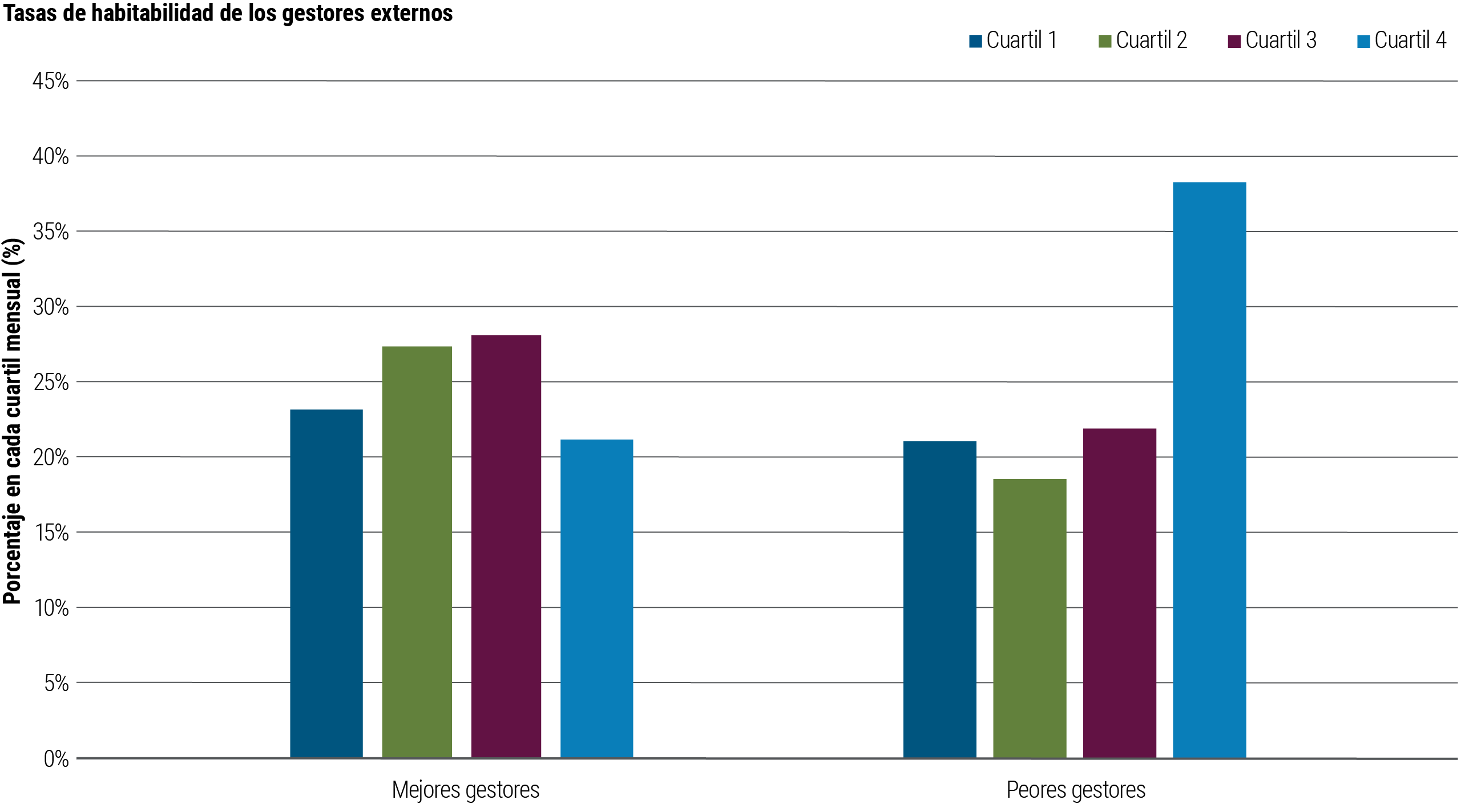 Los mejores y peores inversionistas tuvieron aproximadamente la misma frecuencia de rentabilidad mensual del primer cuartil (23% contra 21%, respectivamente). Pero los mejores inversionistas tuvieron una frecuencia dramáticamente menor de meses malos. Experimentaron rentabilidad mensual del cuarto cuartil el 21% del tiempo, contra el 38% de los peores gestores.