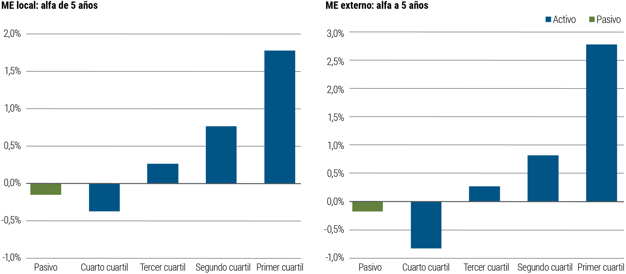 ¿Qué pasa con la inversión pasiva? Fue notablemente consistente, se ubicó en el extremo inferior del tercer cuartil año tras año (ver la gráfica 6).