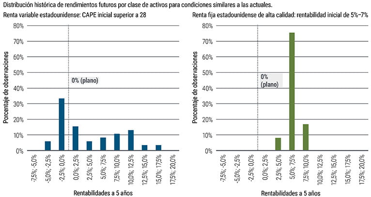 Aunque no son un indicador perfecto, los niveles de partida de los rendimientos de los bonos o de los múltiplos de renta variable nos dan pistas sobre las rentabilidades futuras. El gráfico 1 muestra que, en promedio, los niveles de rendimiento que ofrece actualmente la renta fija de alta calidad han venido seguidos de rentabilidades superiores a largo plazo (típicamente, un atractivo 5%–7,5% en los cinco años posteriores), mientras que el nivel actual del ratio CAPE (precio-beneficio ajustado al ciclo) suele asociarse a un peor comportamiento relativo de la renta variable a largo plazo. Además, históricamente, la renta fija ha proporcionado estos niveles de rentabilidad de forma más consistente que la renta variable, como refleja una distribución más estrecha (más "normal") de las rentabilidades. Es una proposición convincente a favor de la renta fija.
