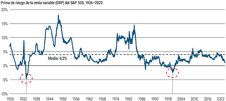 Si profundizamos más en los datos históricos, podemos ver que, en el último siglo, han sido muy pocas las ocasiones en las que la renta variable estadounidense ha estado más cara en relación con la renta fija: por ejemplo, durante la Gran Depresión y la crisis de las puntocom. Una forma habitual de medir la valoración relativa de los bonos frente a las acciones es la prima de riesgo de la renta variable (equity risk premium o ERP). Aunque hay varias formas de calcular la ERP, aquí usaremos la inversa del ratio precio-beneficio (PER) del S&P 500 menos el rendimiento del bono del Tesoro estadounidense a 10 años. La ERP se sitúa actualmente justo por encima del 1%, un mínimo que no veíamos desde 2007 (ver gráfico 2). La historia sugiere que no es probable que la renta variable siga tan cara con respecto a la renta fija; por eso pensamos que puede ser un buen momento para plantearse una sobreponderación en renta fija en las carteras de activos múltiples.