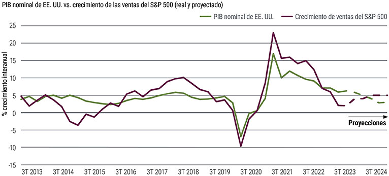 Este optimismo se ve subrayado por las estimaciones de consenso para las ventas y ganancias del S&P 500, que anticipan una reaceleración en vez de una desaceleración (ver gráfico 3). Nos preocupa la posible desconexión entre nuestras perspectivas macro y estas valoraciones y estimaciones de ganancias de la renta variable, lo que refuerza nuestra cautela con respecto a las clases de activos.
