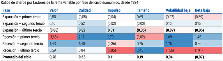En momentos de incertidumbre, preferimos invertir en acciones de calidad. Históricamente, el factor calidad ha representado una opción atractiva en la última fase del ciclo económico (ver gráfico 5). Dentro de nuestra posición neutra general, estamos sobreponderados en renta variable estadounidense (S&P 500), que ofrece más características de calidad que otras regiones, sobre todo mercados emergentes. Además, el crecimiento europeo podría sufrir más que el de EE. UU., por lo que estamos infraponderados en el mercado local de renta variable, pese a que ofrece unas valoraciones más atractivas.