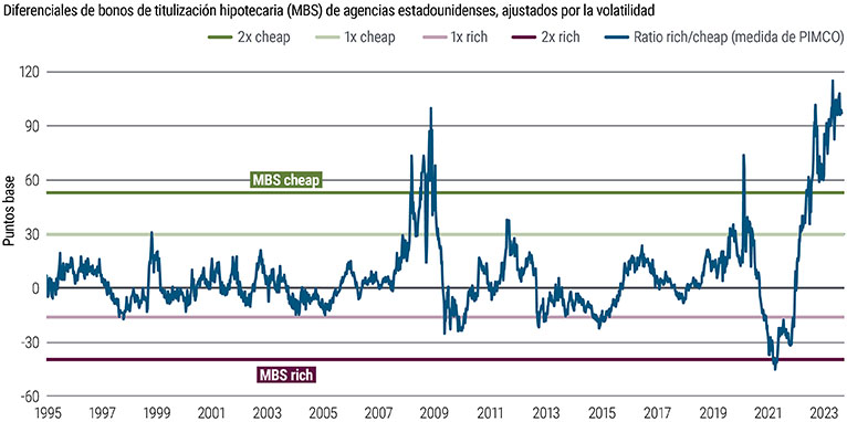 A diferencia del crédito corporativo, las titulizaciones hipotecarias (MBS) y los bonos titulizados ofrecen diferenciales más interesantes. Mantenemos una asignación elevada a MBS de agencias estadounidenses, que presentan una alta calidad, son líquidos y cotizan a unas valoraciones muy atractivas (ver gráfico 6). También vemos valor en posiciones sénior de ciertos activos titulizados como obligaciones garantizadas por préstamos (CLO) y obligaciones garantizadas por hipotecas (CMO).