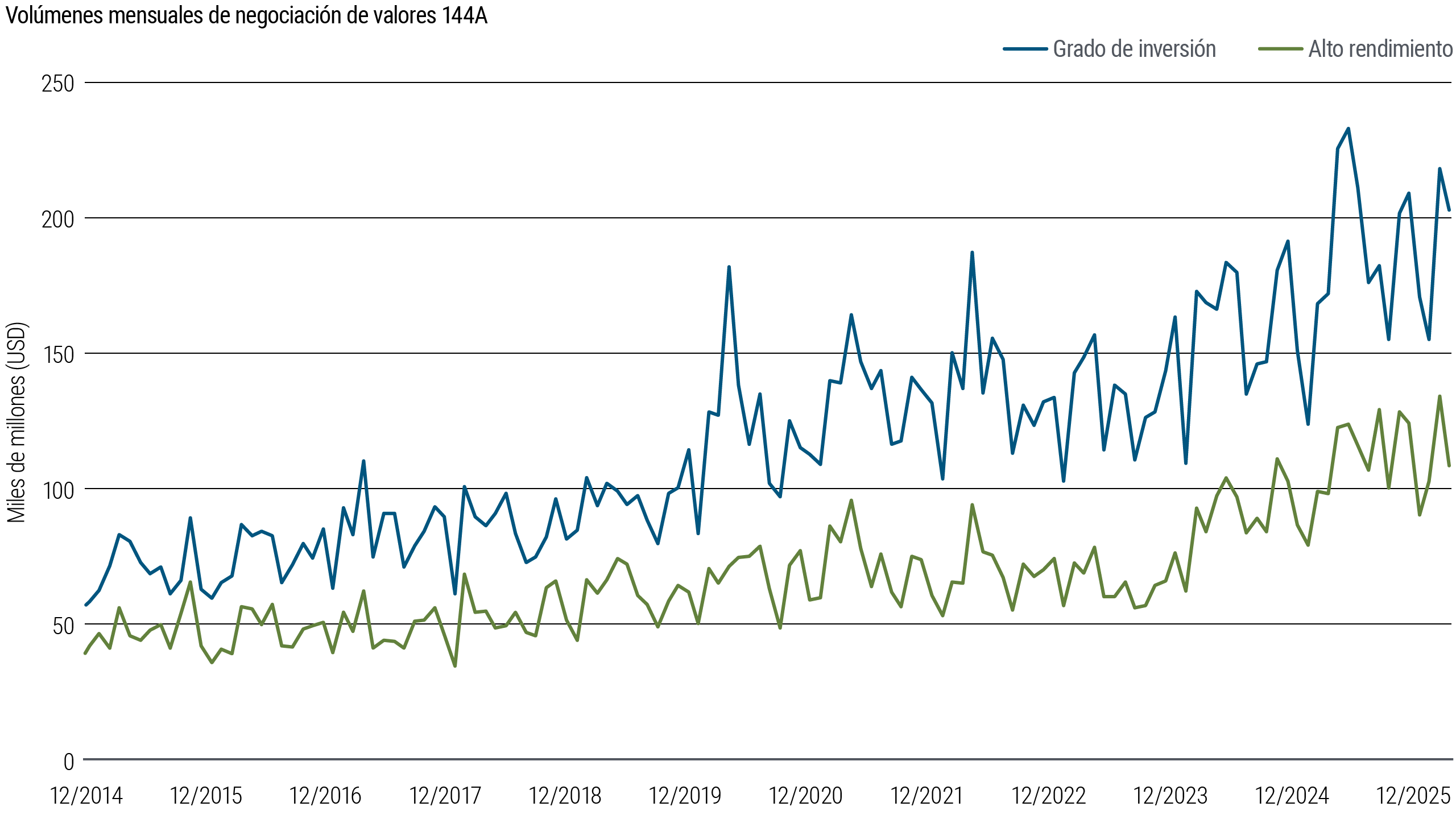 Como contexto, los valores 144A representan aproximadamente el 18% del mercado de grado de inversión (IG, por sus siglas en inglés) en dólares estadounidenses y el 82% del mercado de alto rendimiento (HY, por sus siglas en inglés), con volúmenes mensuales de negociación en torno a $200.000 millones en IG y $100.000 millones en HY (ver gráfico 1). Por lo tanto, es fundamental distinguir la liquidez consolidada de los mercados 144A de la persistente iliquidez del verdadero crédito privado, ya sea de grado de inversión o de otro tipo.