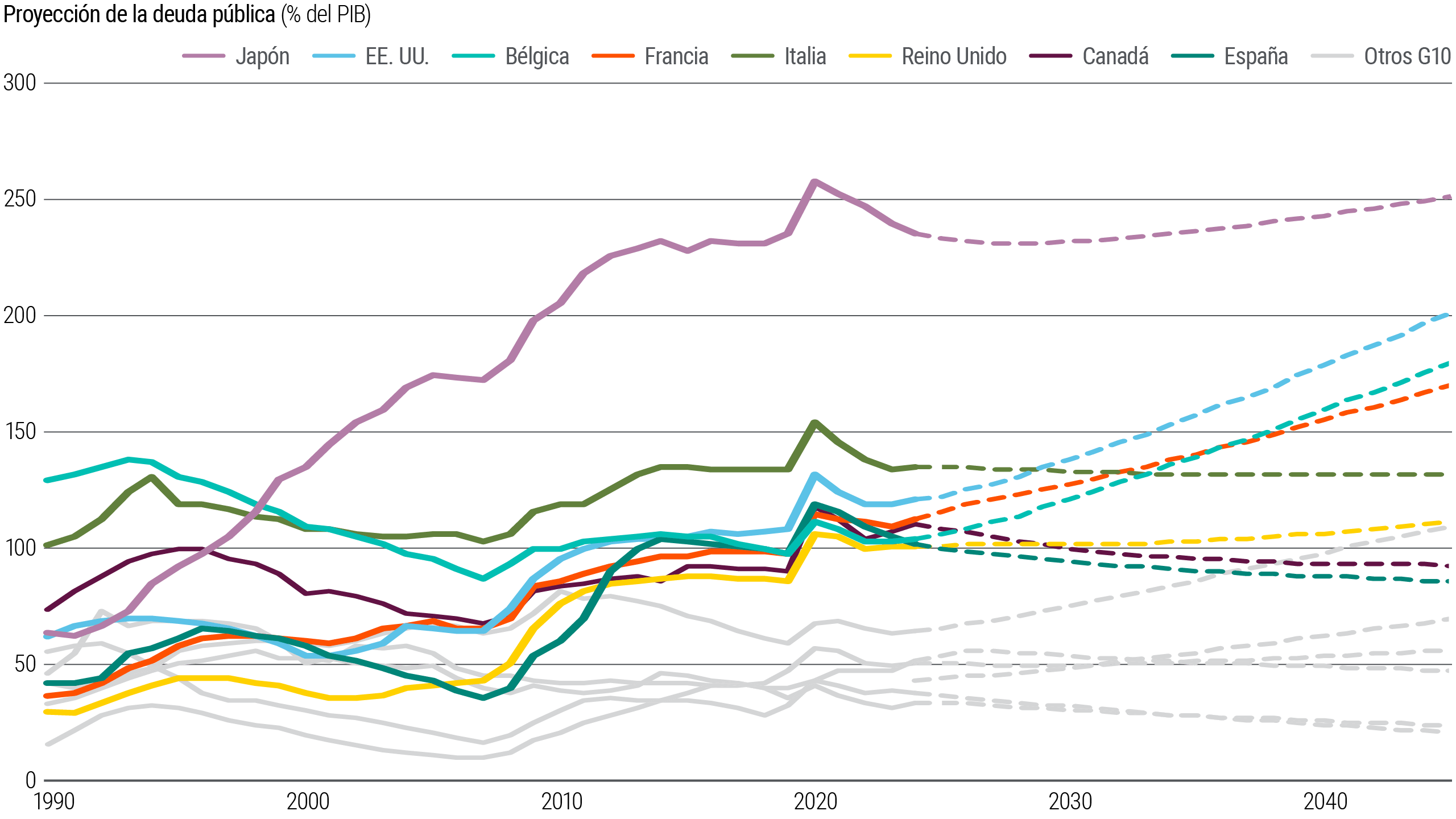 Aunque se encuentra cerca de máximos históricos, la deuda sigue siendo sostenible en la mayoría de los países desarrollados. Entre las excepciones notables se incluyen Japón, Estados Unidos y Francia, donde la deuda sigue una trayectoria insostenible a largo plazo, incluso más que el año pasado (ver el gráfico 1). Es probable que los déficits permanezcan por encima de los niveles previos a la pandemia, en parte debido al aumento de los costos por intereses.