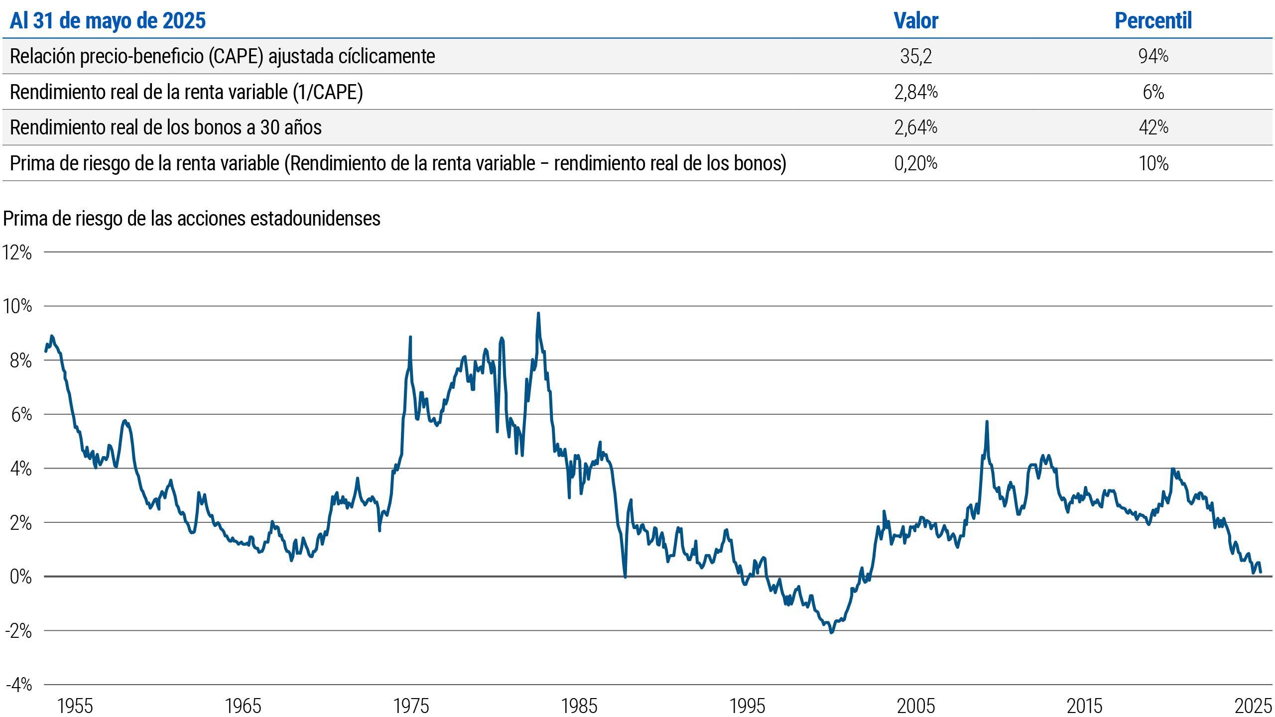 La prima de riesgo de las acciones —la diferencia entre los rendimientos de las acciones y los rendimientos de los bonos— probablemente sea el componente principal en la asignación de activos, ya que mide el valor relativo entre acciones y bonos. La forma más directa de calcular esta prima es restar el rendimiento real (ajustado por inflación) de los bonos al rendimiento de ganancias ajustado cíclicamente. El gráfico 2 muestra que la prima de riesgo de las acciones en EE.UU. se sitúa en cero, un nivel excepcionalmente bajo según los estándares históricos.