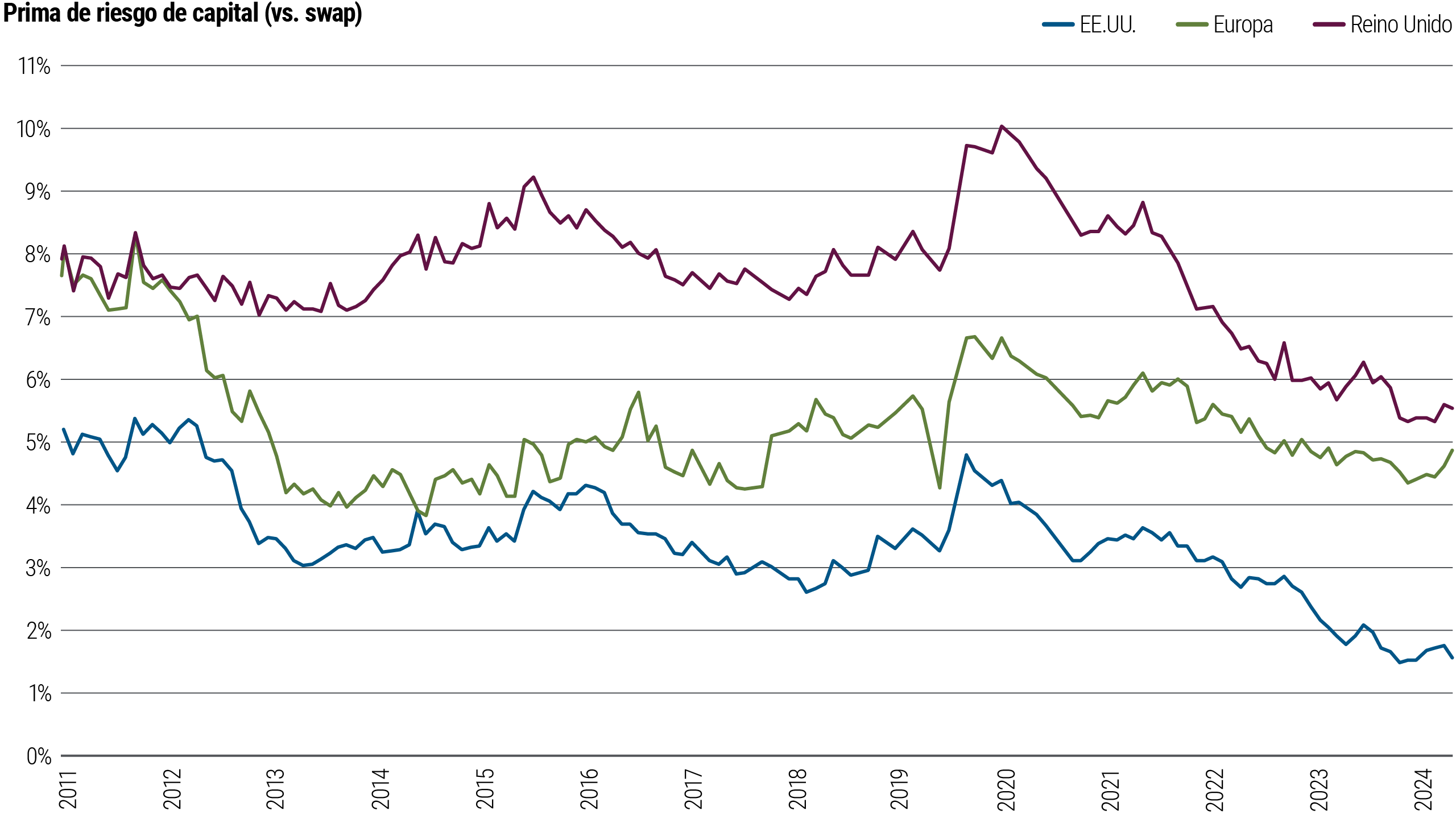 Hemos estado reduciendo las asignaciones a bonos de vencimiento más largo, que consideramos relativamente menos atractivos. Con el tiempo, y a gran escala, este es el tipo de comportamiento de los inversionistas que puede cumplir el papel de vigilantes de los bonos, disciplinando a los gobiernos al exigir una mayor compensación. Preferimos vencimientos a corto y mediano plazo, donde los inversionistas pueden encontrar rendimientos atractivos sin asumir un mayor riesgo de tasa de interés.