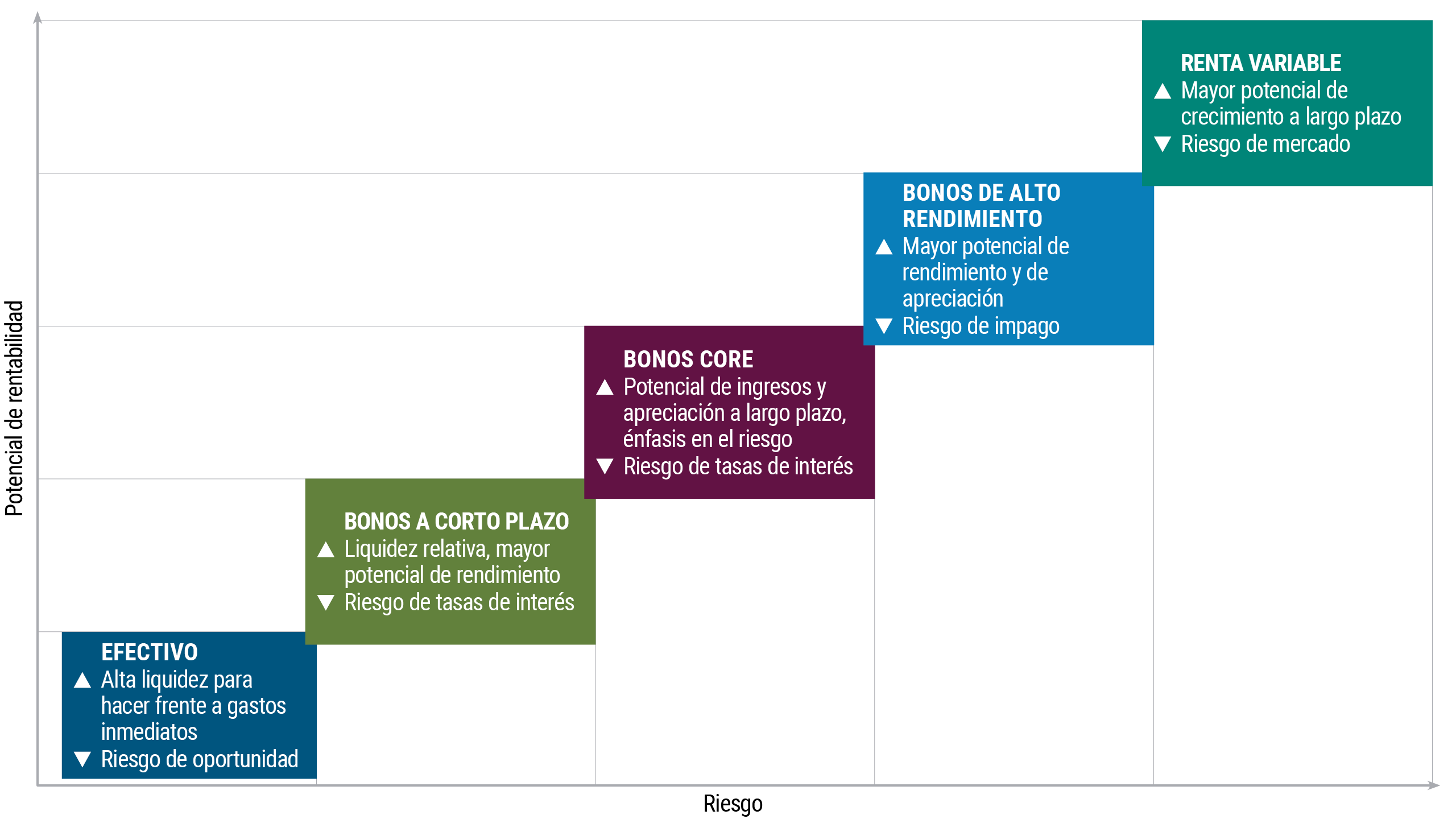 Cada activo presenta su propio perfil de rentabilidad-riesgo. El efectivo, por ejemplo, conlleva el riesgo más bajo, pero también ofrece el menor potencial de rentabilidad. Por el contrario, la renta variable y los activos alternativos pueden conllevar un riesgo más alto, pero también ofrecen un mayor potencial de rentabilidad.