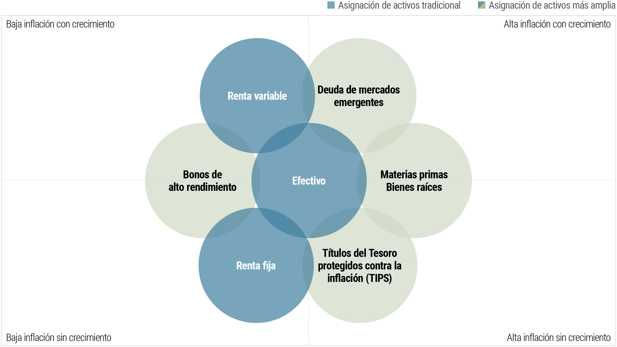 Un portafolio diversificado invierte en diferentes clases de activos, pero también diversifica las inversiones dentro de cada clase de activos. Mantener un portafolio diversificado puede ayudar a los inversionistas a estar más preparados ante los posibles cambios económicos y de tasas de interés, lo que no solo les permite aprovechar oportunidades, sino que también minimizar los riesgos asociados con una concentración excesiva en una determinada clase de activos.