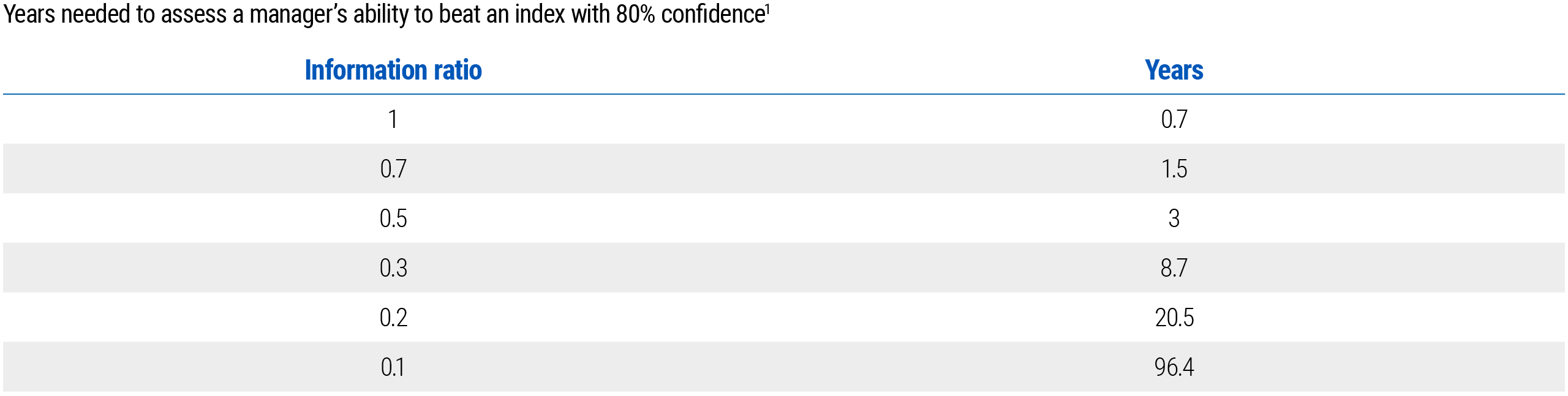 However, if a manager’s information ratio is low, the number of years required to evaluate performance increases exponentially. For a hypothetical manager with an information ratio of 0.2, it would take about 20 years to evaluate performance with 80% confidence.
