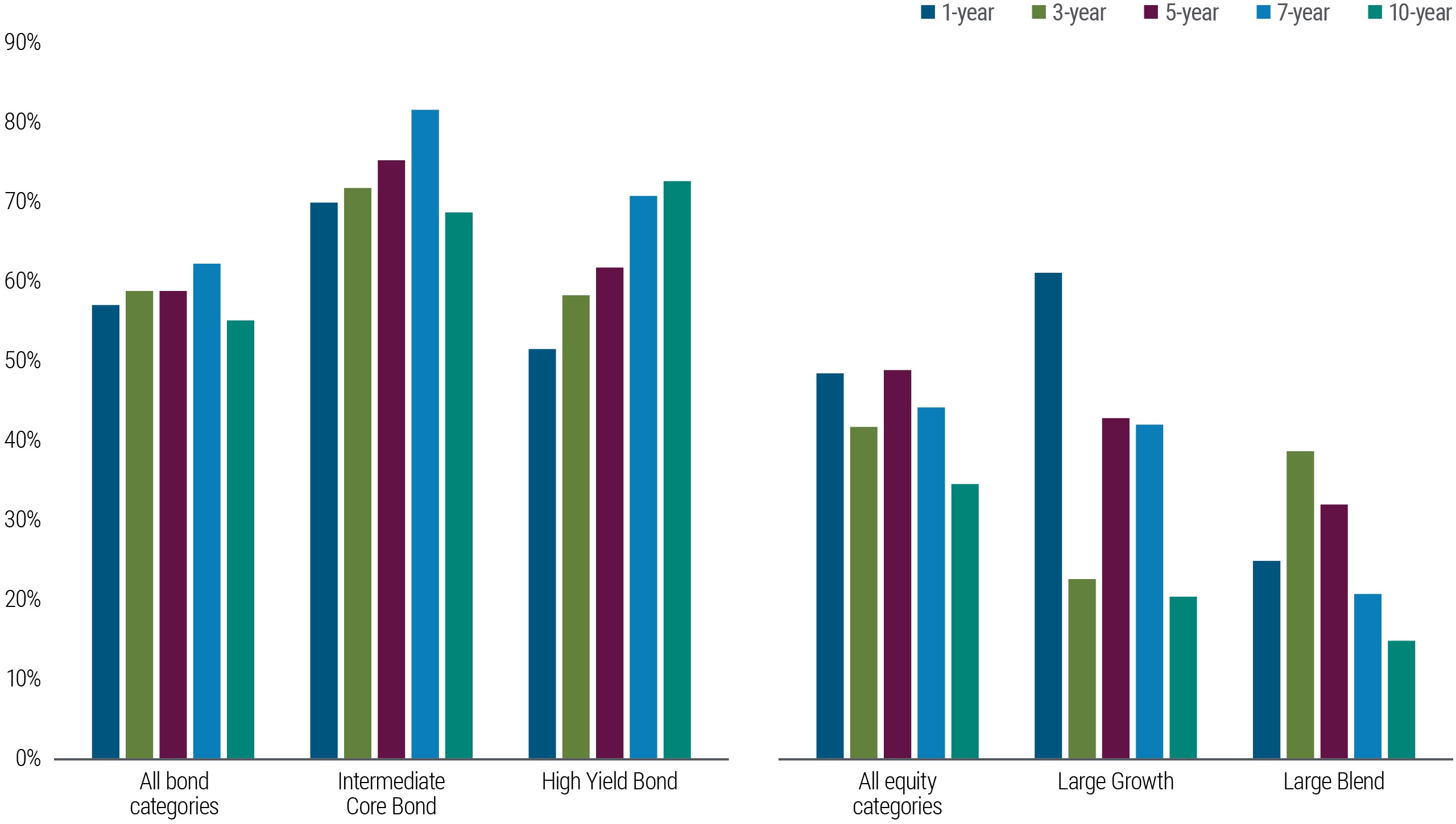 In stark contrast, only 34% of active equity mutual funds and ETFs outperformed their median passive peers after fees over the past 10 years. Within the two largest Morningstar equity categories for the same period, only 20% of active funds and ETFs outperformed their median passive peers in Large Growth and 15% in Large Blend.
