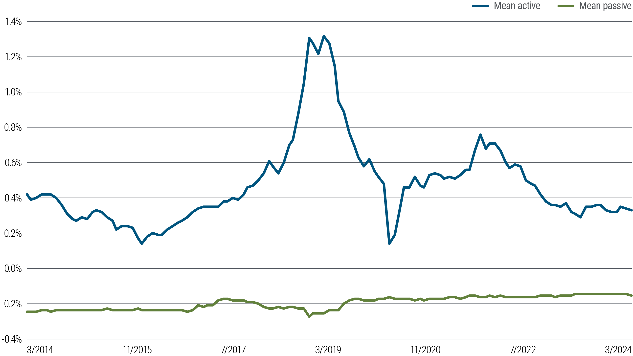 This pattern has been relatively persistent over the past two decades. Figure 6 shows the average annualized alphas (after fees) for both active and passive funds in the largest Morningstar fixed income categories, using a rolling 10-year window.