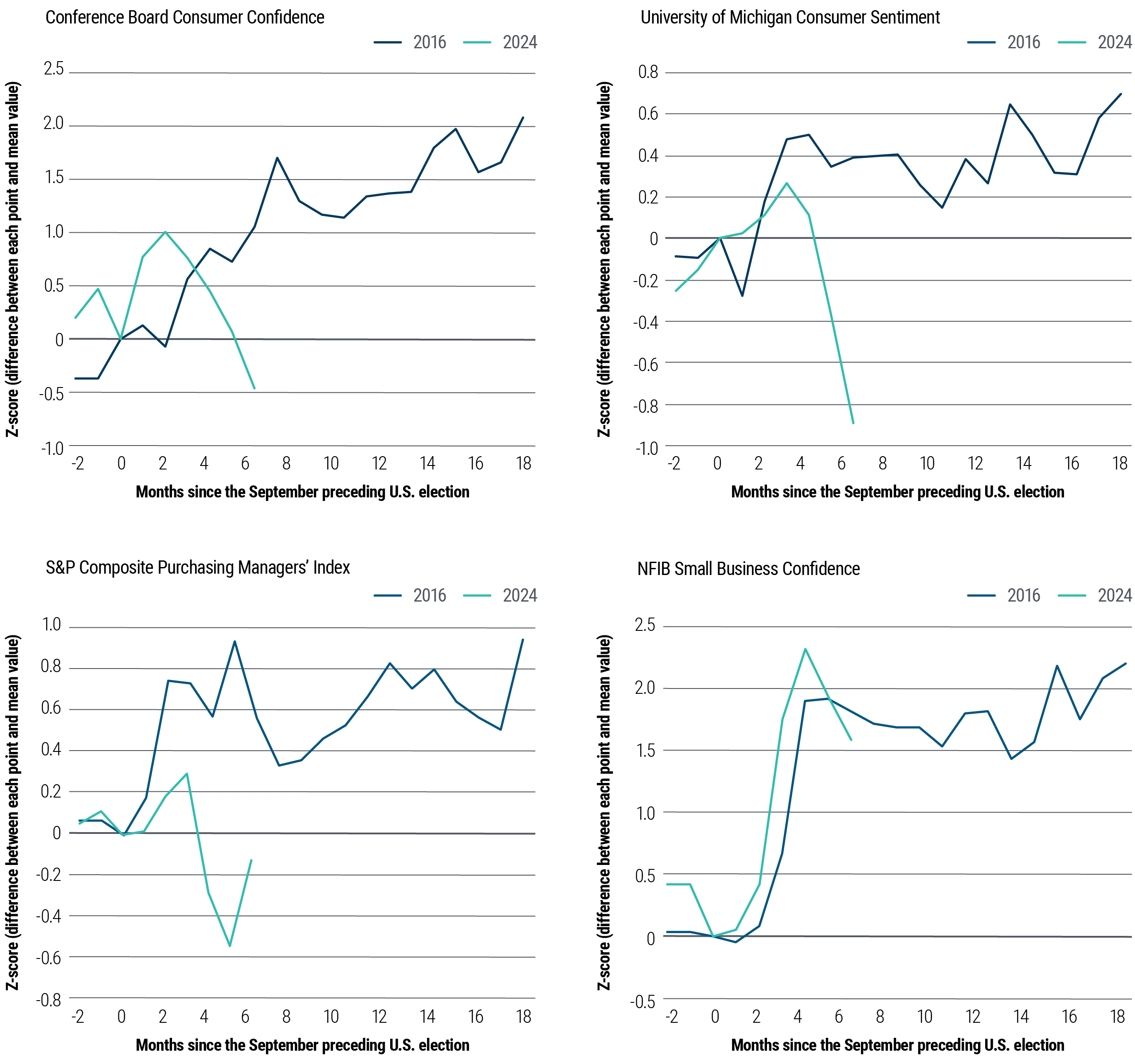 Source: Conference Board, University of Michigan, S&P, NFIB, Haver Analytics, and PIMCO as of March 2025