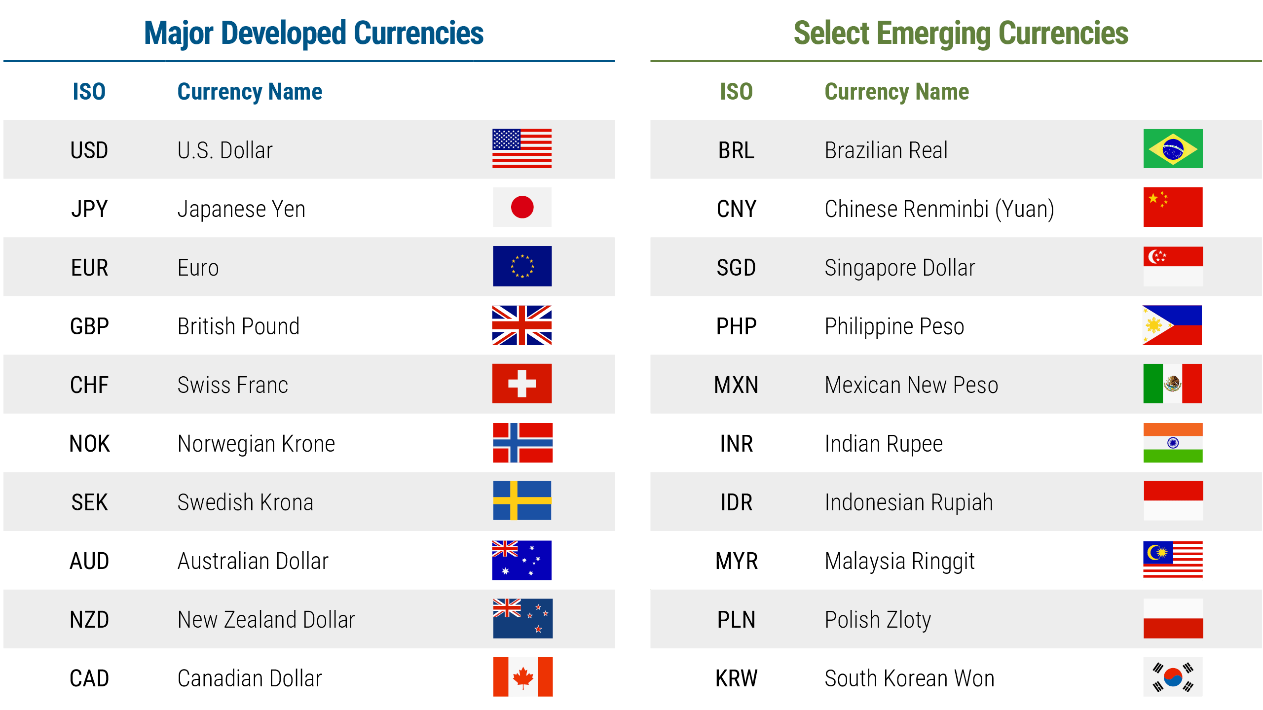 Currency describes the money or official means of payment in a country or region. The best-known currencies include the U.S. dollar ($), euro (€), Japanese yen (¥), British pound (£), and Swiss franc. While currency symbols exist for most currencies, the foreign exchange (FX) markets use ISO (International Organization for Standardization) codes to identify currencies. Some of these ISO codes are included in the chart below: