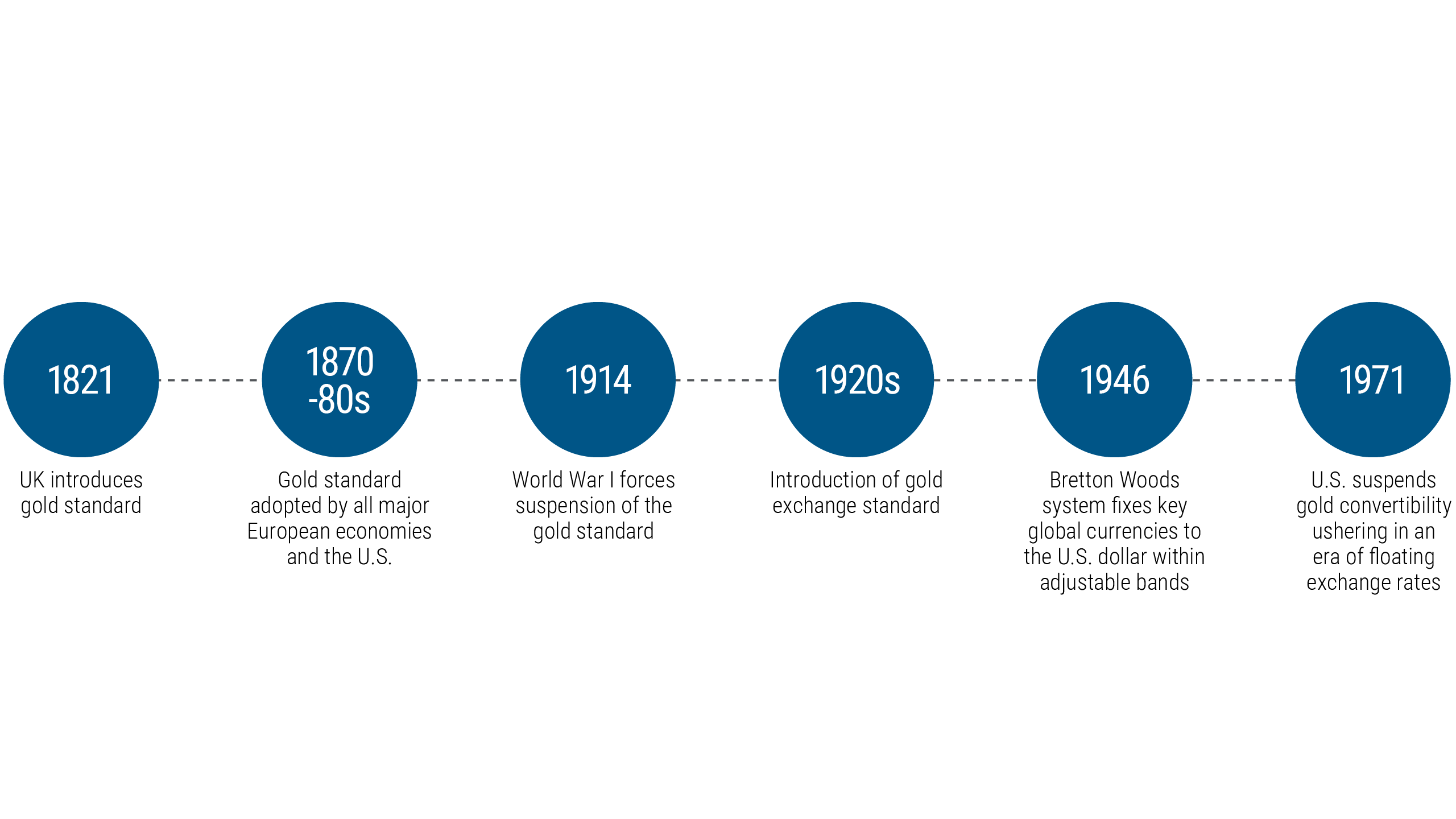 In times of war or crisis, maintaining sufficient gold reserve levels was difficult. During World War I, many countries had to abandon the gold standard. In the late 1920s, the “gold exchange standard” was introduced, which allowed the exchange of a local currency for gold or for other currencies that were still backed by gold, such as the British pound and the U.S. dollar. Thus, the first “reserve currencies” were born. However, the economic crisis that began in 1929 took its toll; in 1931, the United Kingdom suspended the gold standard and many other countries followed.