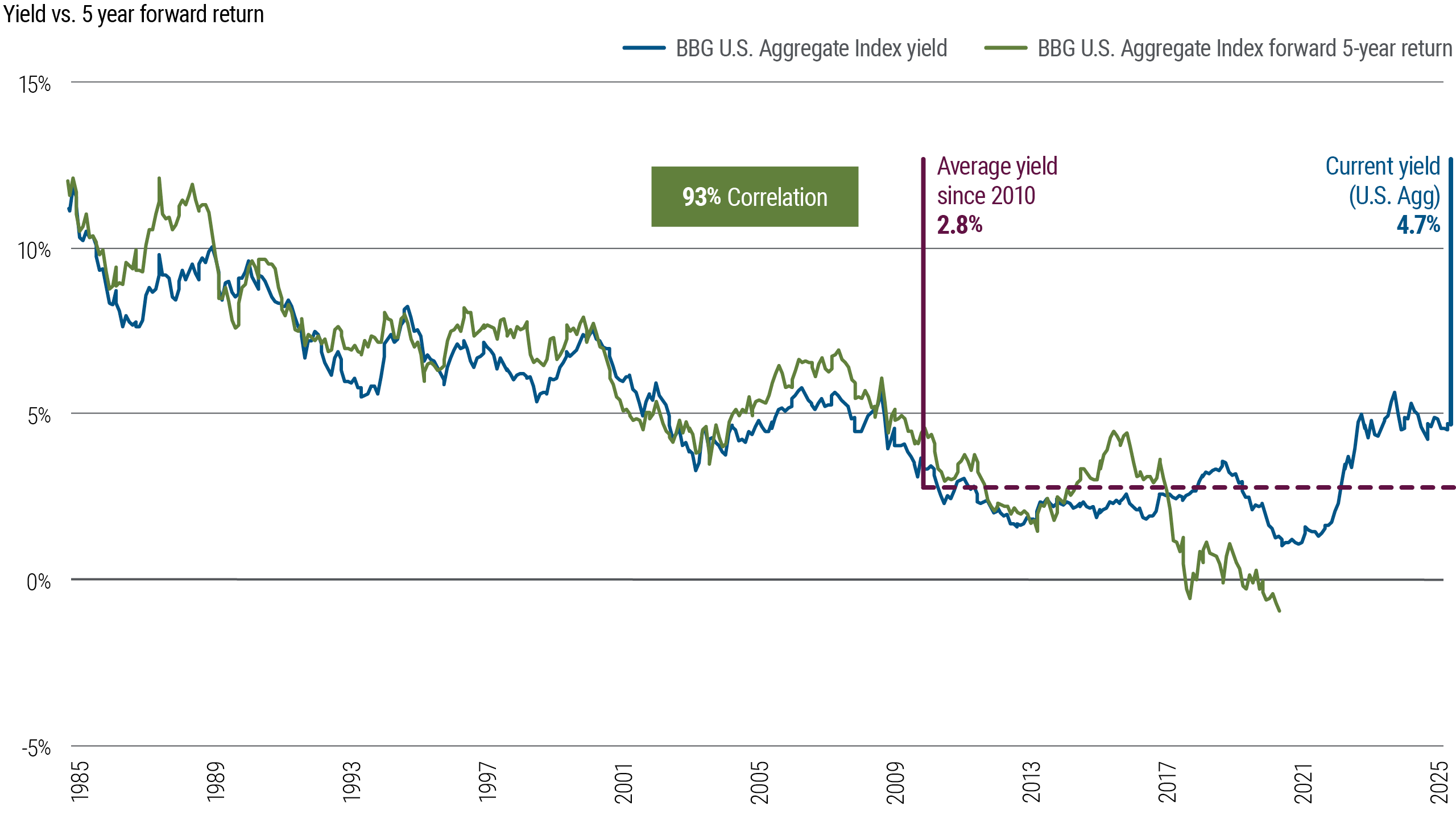 Forecasting fixed income returns is relatively straightforward: Over a secular horizon, the starting yield on a bond portfolio can be a good guide to expected returns (see Figure 3). The yields on the Bloomberg U.S. Aggregate and the Global Aggregate (U.S.-dollar-hedged) Indexes, two common benchmarks for high quality bonds, are about 4.74% and 4.94%, respectively, as of 5 June 2025.