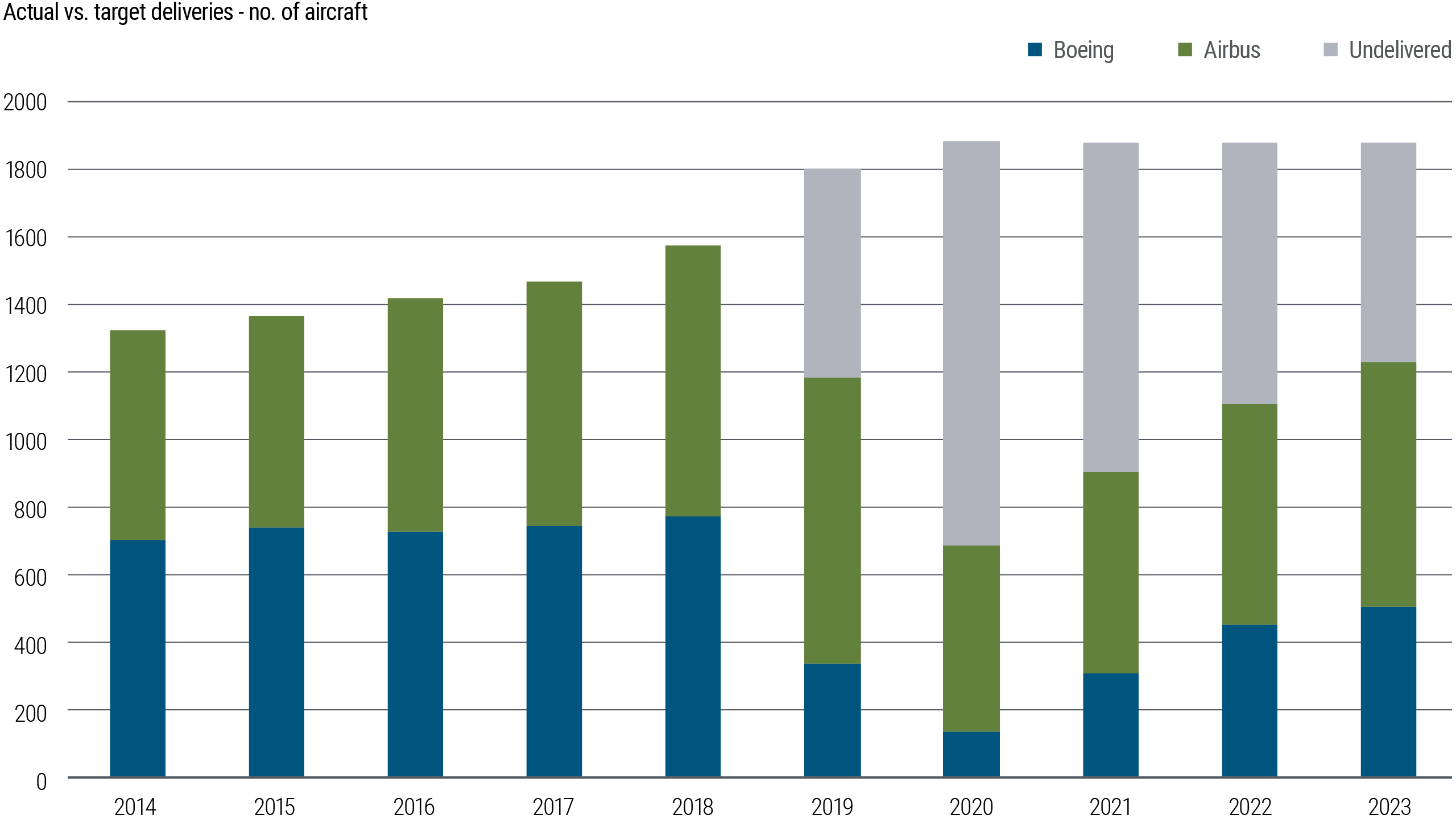 - Aviation finance: Capital needs continue to grow in this sector. Barriers to sourcing and servicing the underlying collateral remain high, while the collateral itself exhibits strong fundamentals. The aviation industry has faced substantial disruption from the pandemic and the Russia-Ukraine conflict. However, after taking on $250 billion in incremental debt, airlines returned to profitability in 2023 by focusing on cost-cutting and increasing fleet capacity to meet increasing travel demand, with revenue passenger kilometers (RPKs) surpassing pre-COVID levels. Production issues and a persistent backlog in aircraft manufacturing have limited the availability of new planes, with original equipment manufacturers delivering 35% fewer aircraft (4,200 planes) than ordered from 2019 to 2023 (see Figure 3). With this supply/demand imbalance growing, we believe lease rates on new and mid-life aircraft offer attractive yield and income potential (for more, watch “Aviation Finance: Capturing Opportunities in Private Credit”).