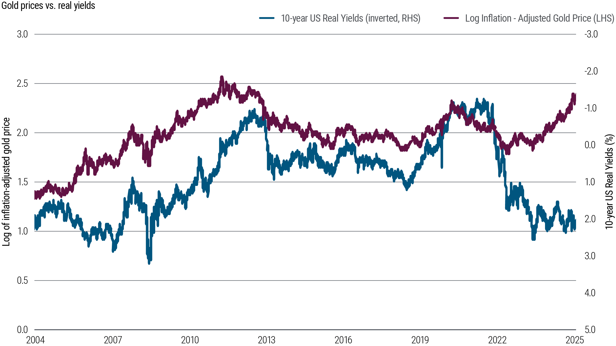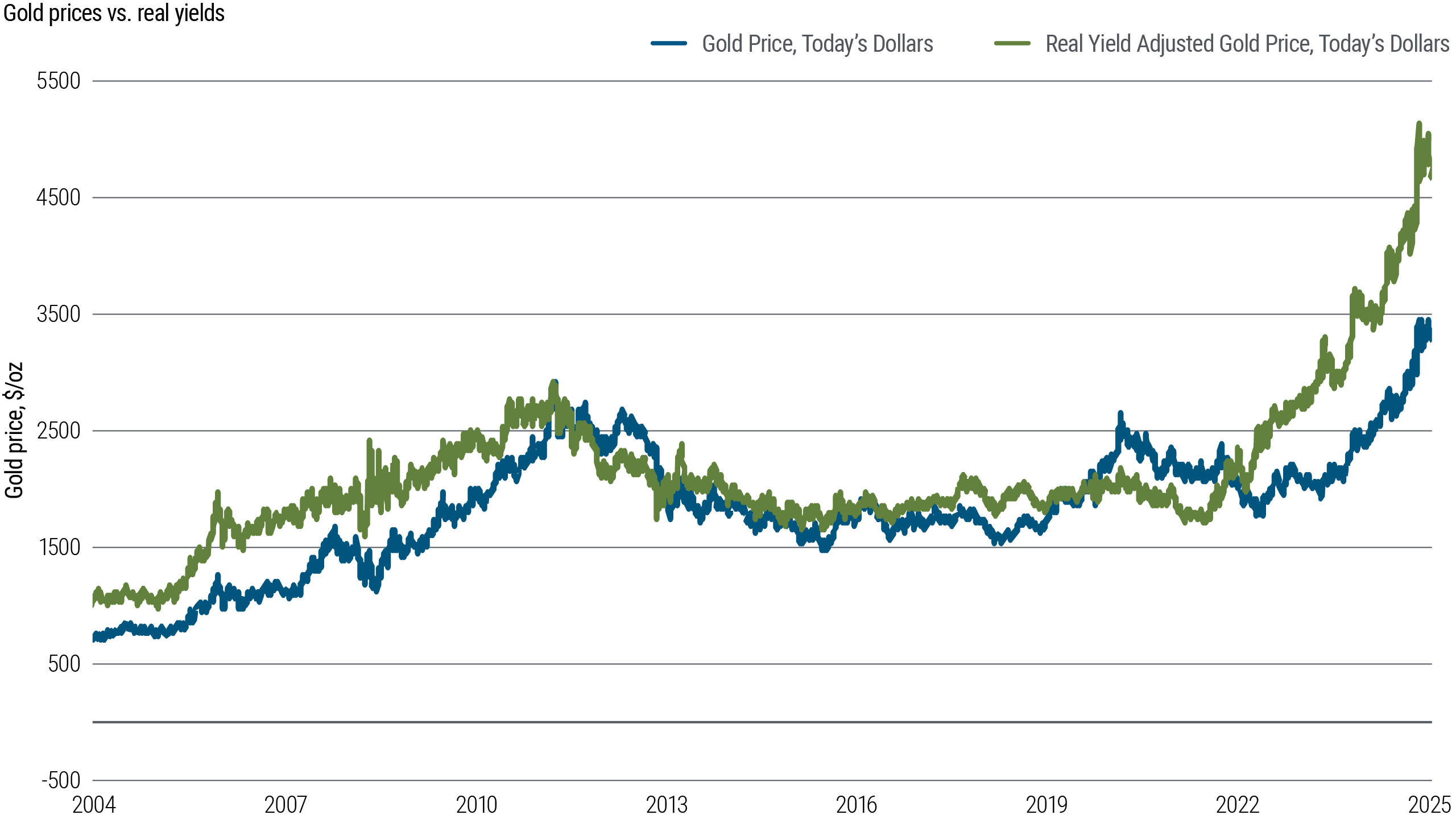 Similarly, the “safe haven” bid for gold has not only been evident, but more prevalent in recent years. For example, in early 2022 gold prices jumped amid Russia’s invasion of Ukraine, despite real yields increasing. Since then, we have seen an unprecedented increase in global central banks’ gold purchases driven in part by an effort to de-dollarize and repatriate their reserves. We have also seen an increase in retail demand, as evidenced by rising ETF flows, especially following the 2024 U.S. election cycle. This “sticky” safe haven buying contributed to a run-up in gold prices, which reached all-time highs in early 2025, decoupling the link between prices and real yields for the time being.