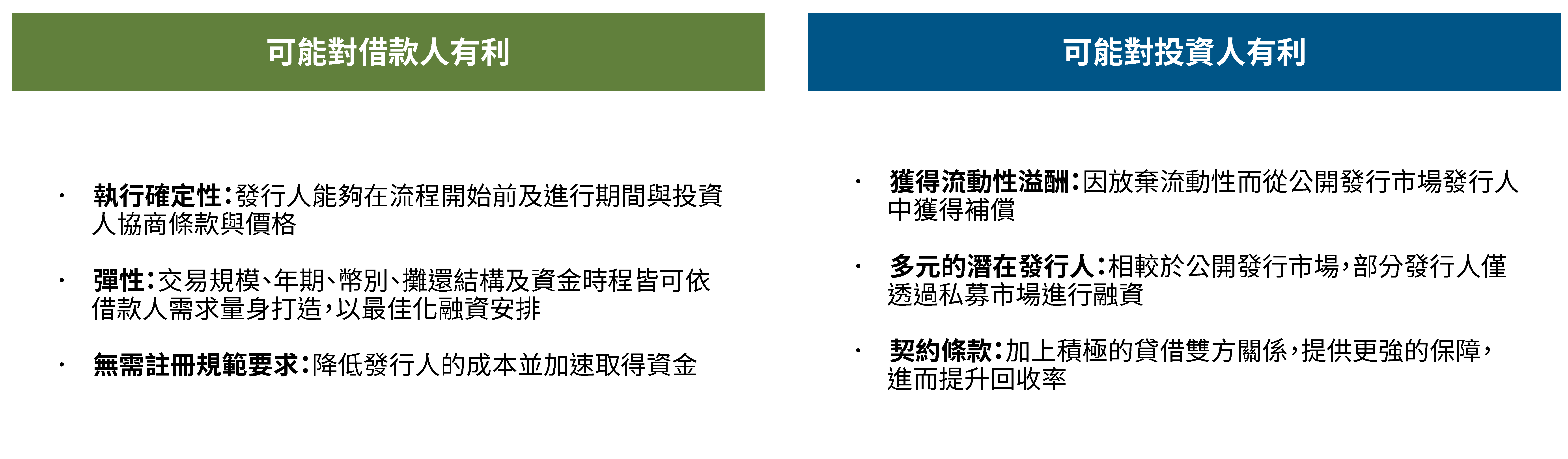 若要更深入了解私募投資等級債券的目的,從借款人與投資人的角度來看其優勢會有所幫助。