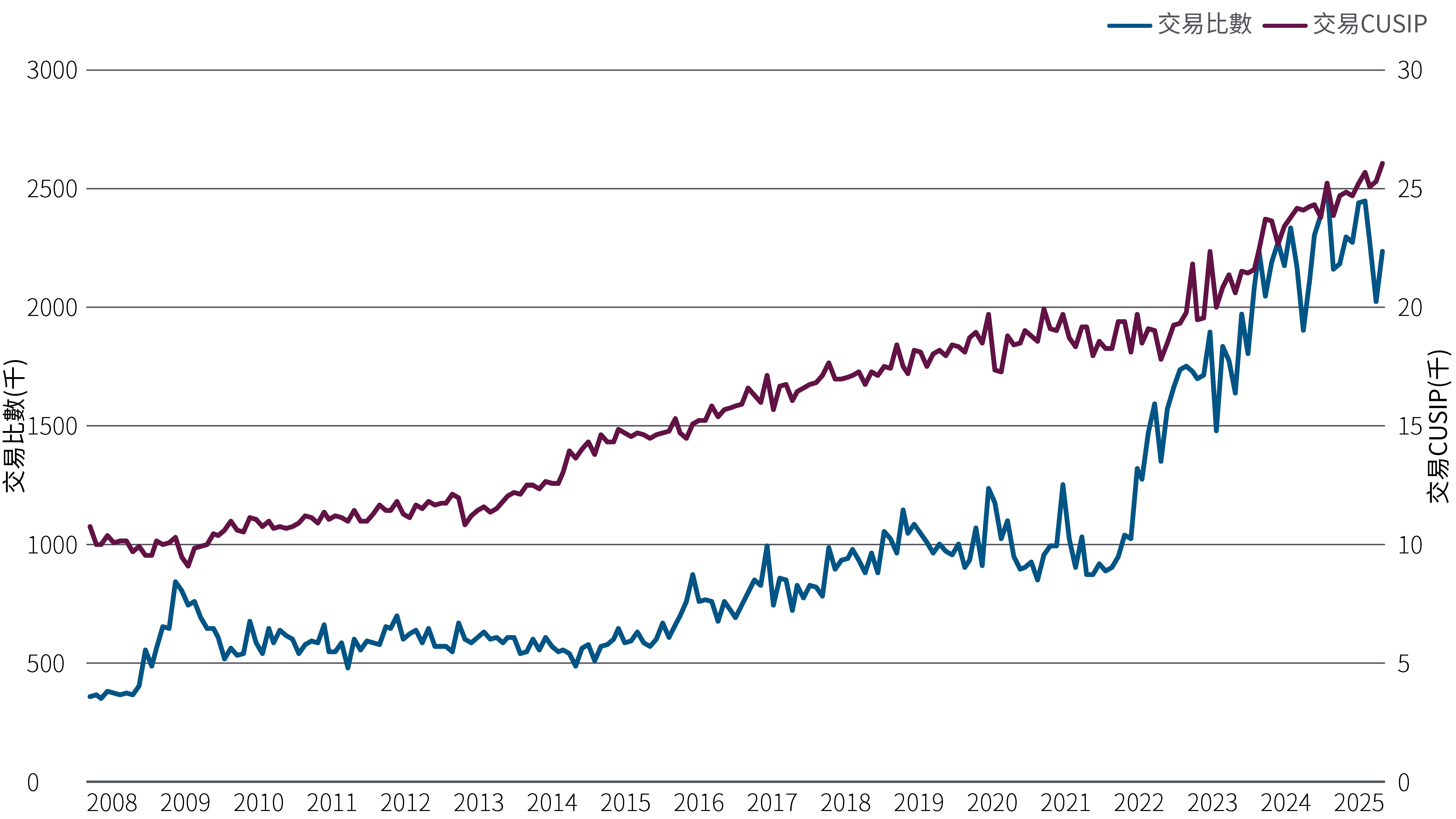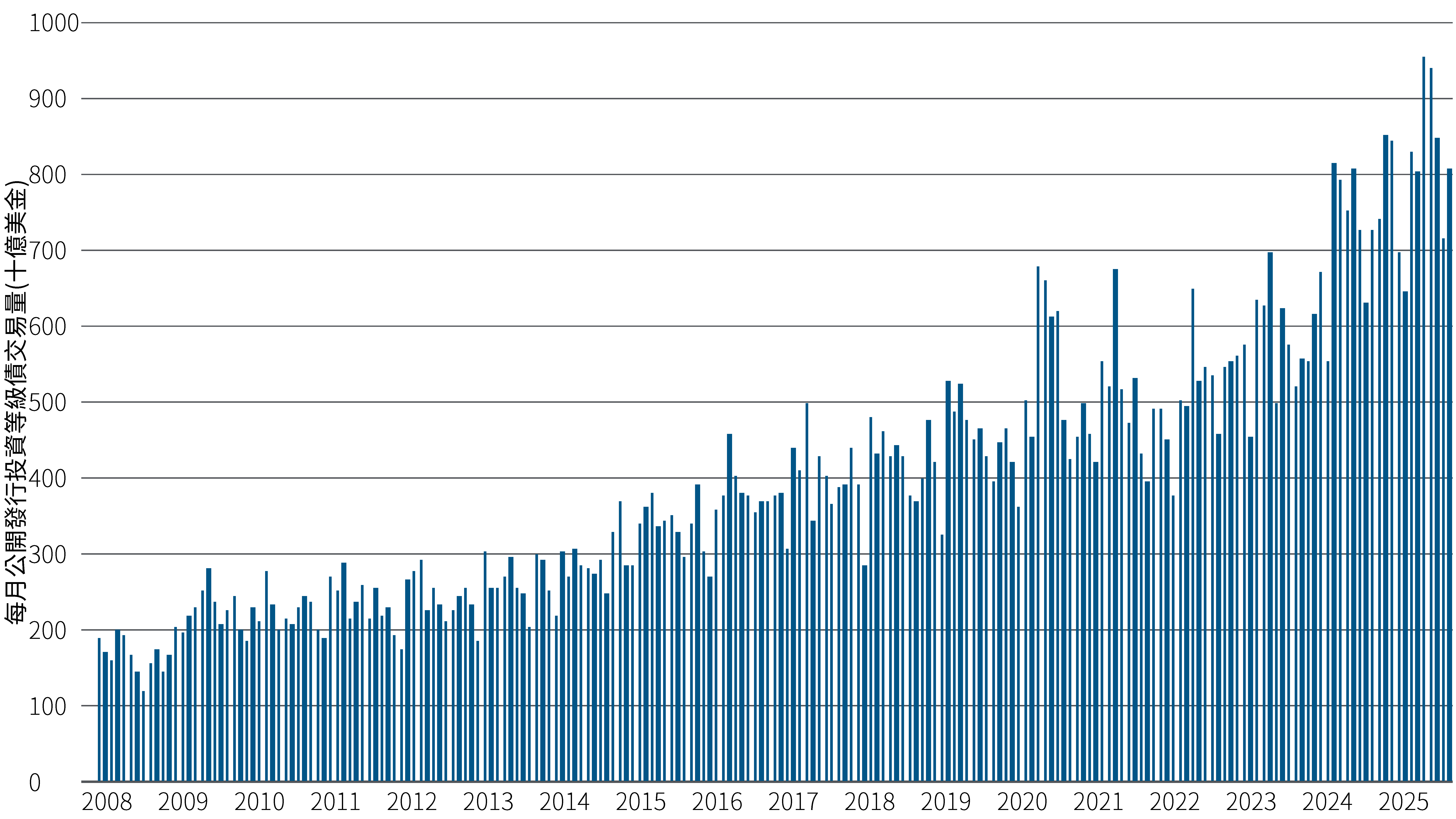 公開發行投資等級債券受益於深厚且具流動性的市場,每月交易量達數千億美元(見圖2)。這種流動性使投資人能夠快速買賣,通常在幾分鐘內完成,且對價格影響極小。