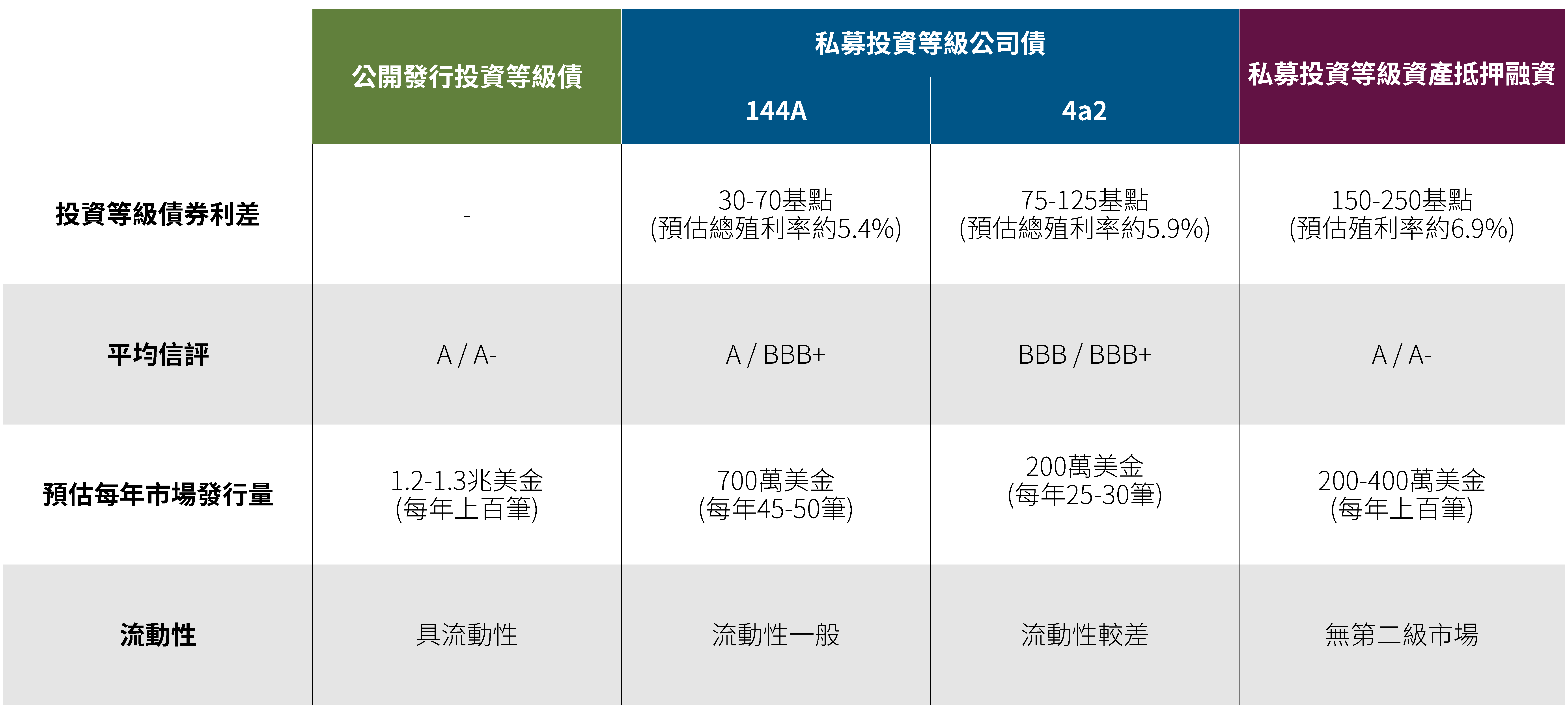 私募投資等級債券涵蓋企業貸款到資產抵押融資,是一個已存在數十年的市場,目前仍具吸引力。然而,與公開發行投資等級債券市場相比,其流動性較低、結構更複雜、透明度也較差,因此投資人應謹慎面對。