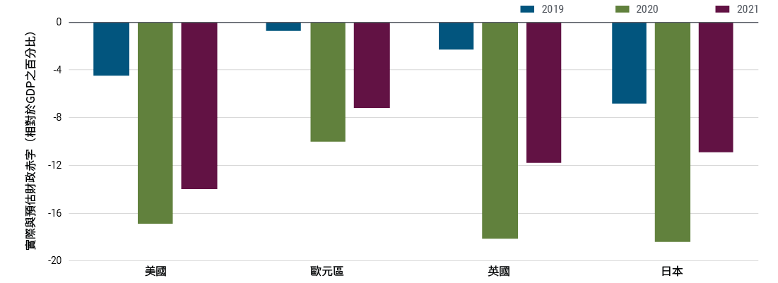 除了藉由施打疫苗控制疫情之外,財政政策同樣是左右PIMCO週期市場展望的主要搖擺因素(請參閱風險章節,進一步瞭解潛在的下檔風險)。由於寬鬆的貨幣政策持續壓低資金成本,因此大多數國家將透過財政轉移的方式繼續補貼家庭所得,同時藉由提供貸款擔保、補助、與減稅的方式支持民間企業(圖二)。在歐洲,除了各國自行編列財政刺激的預算之外,歐盟在12月通過預算法案,預計將在今年透過歐盟新世代基金(EU Next Generation Fund)提供大量的貸款與補助資金。