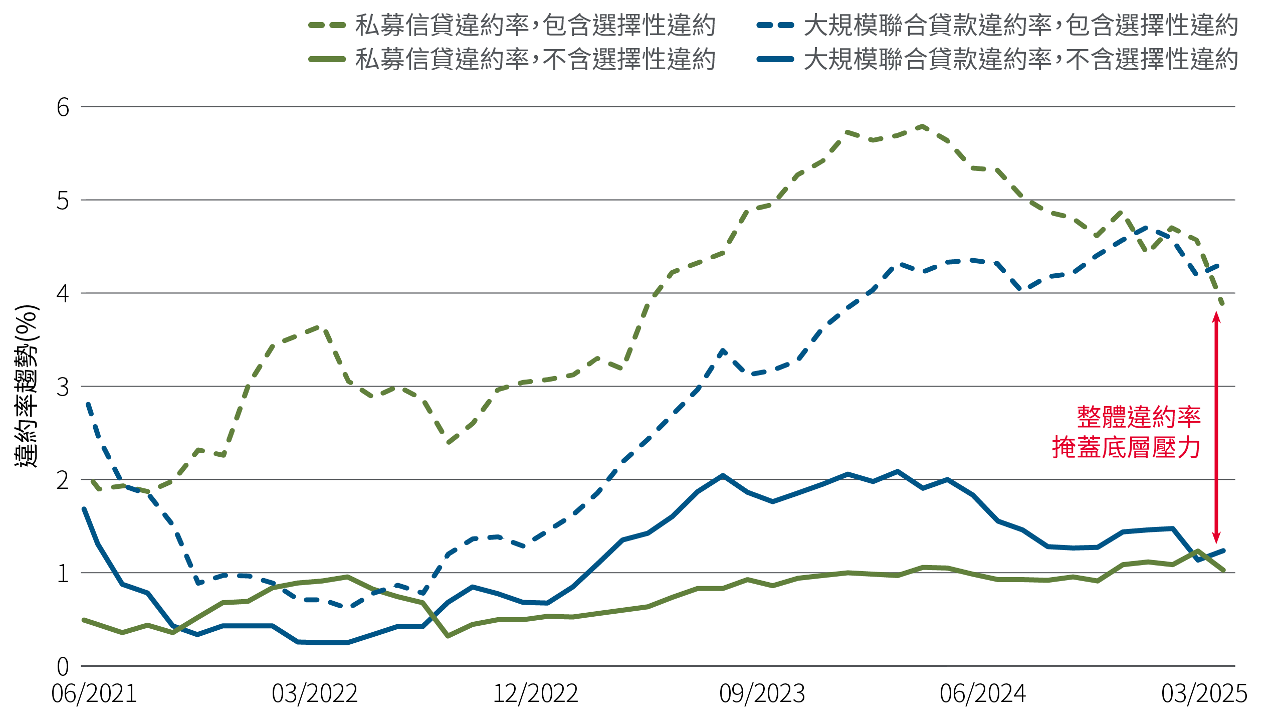 我們觀察到債務條款修訂活動增加,例如實物支付融資(PIK)條款,允許借款人以新增債務償還既有債務。此類趨勢可能會掩蓋潛在的壓力,使違約率保持在較低水準(見圖 4)。