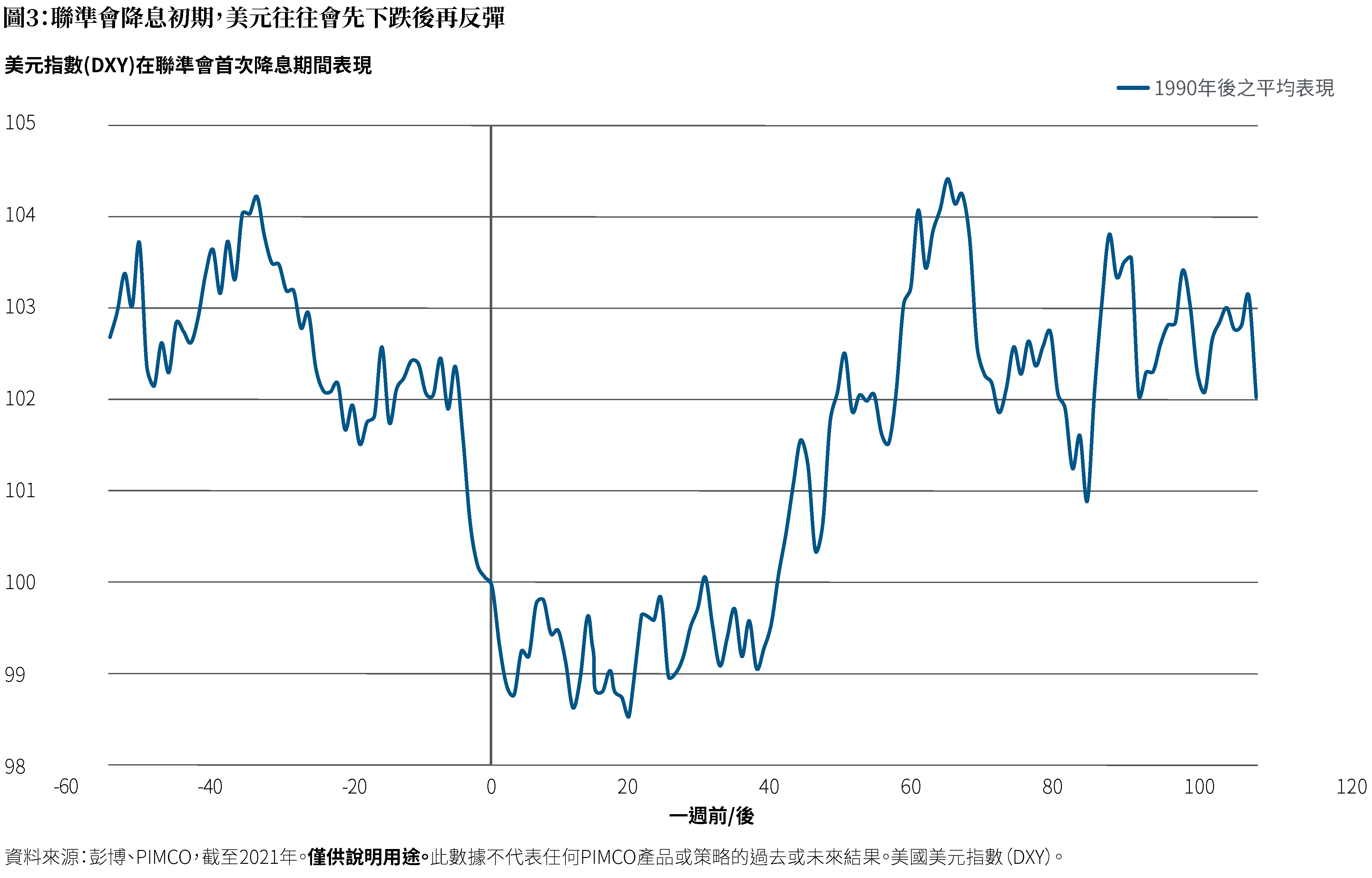 美元可能會下跌,至少暫時如此。在過去,無論是硬著陸或是軟著陸的降息週期,平均而言,美元都傾向在第一次降息後的幾個月內先下跌再回彈(見圖3)。我們認為隨著利率政策正常化,美元有可能失去較高收益貨幣的地位,且可能會溫和下跌。