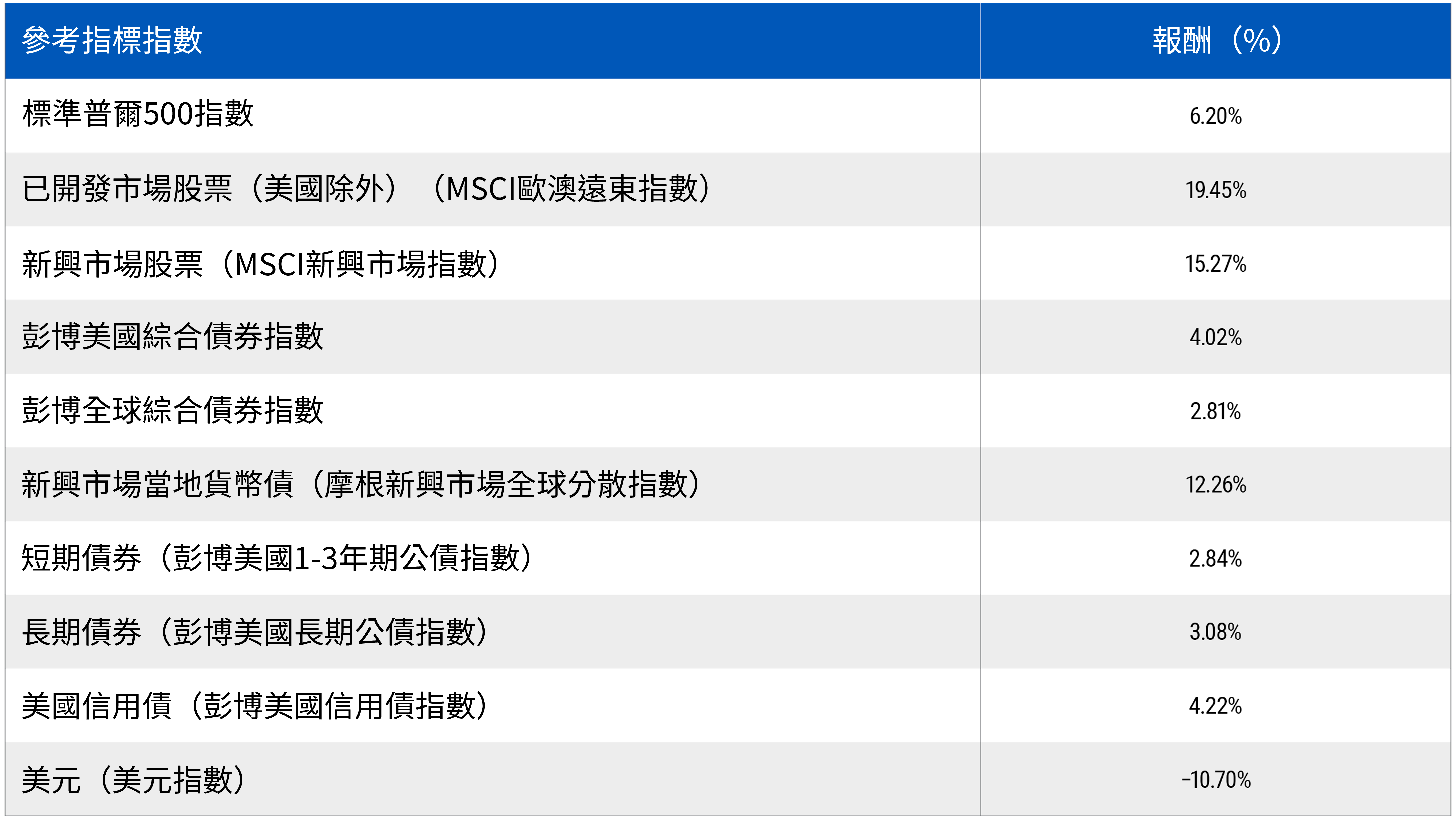 儘管美國資產表現良好,國際市場表現往往更加出色,包括已開發與新興市場。股票在波動中取得可觀報酬;債券則展現自身優勢,波動相對較低。新興市場本地貨幣債的報酬與新興市場股票旗鼓相當,突顯全球投資機會的廣度。