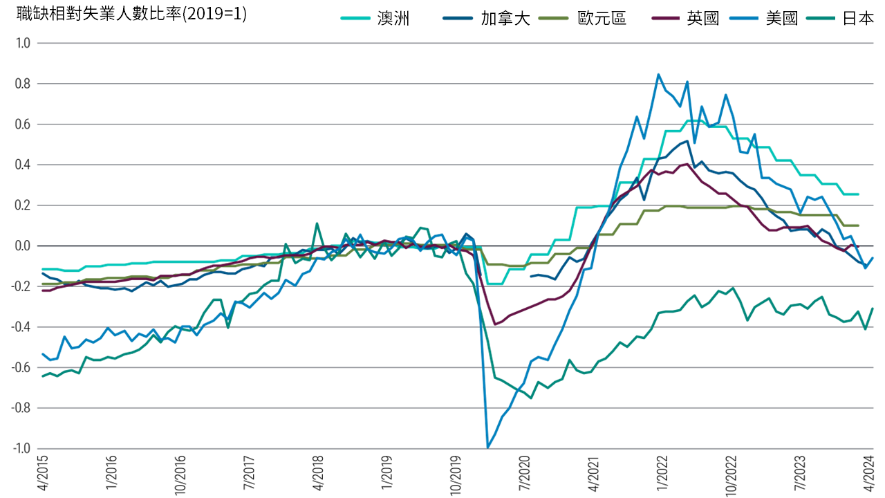 美國經濟較為強韌的成長和通膨狀況,延遲了聯準會相較於其他央行,啟動其降息循環的時間。然而,前瞻性通膨指標顯示,邁向聯準會的2%通膨目標可能會在2025年取得進展。支持這種展望的因素包括單位勞動成本通膨接近2%、職缺相對於失業率低於2019年水準(見圖 2),以及持續上升的失業率可能會超出聯準會舒適區的4.2%範圍。