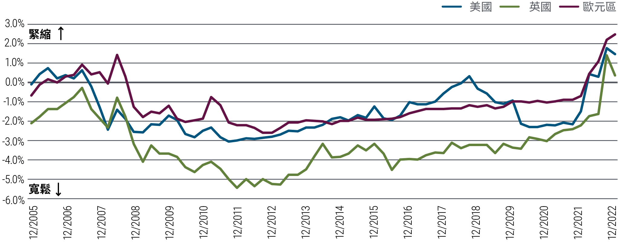 放眼幾個主要經濟體,貨幣政策可能已經達到緊縮水準 (見圖 2)。 儘管已開發市場的名目隔夜利率仍低於通膨率,但一旦通膨降溫、央行走到暫停升息週期的時點時,這樣的情況可將轉變。