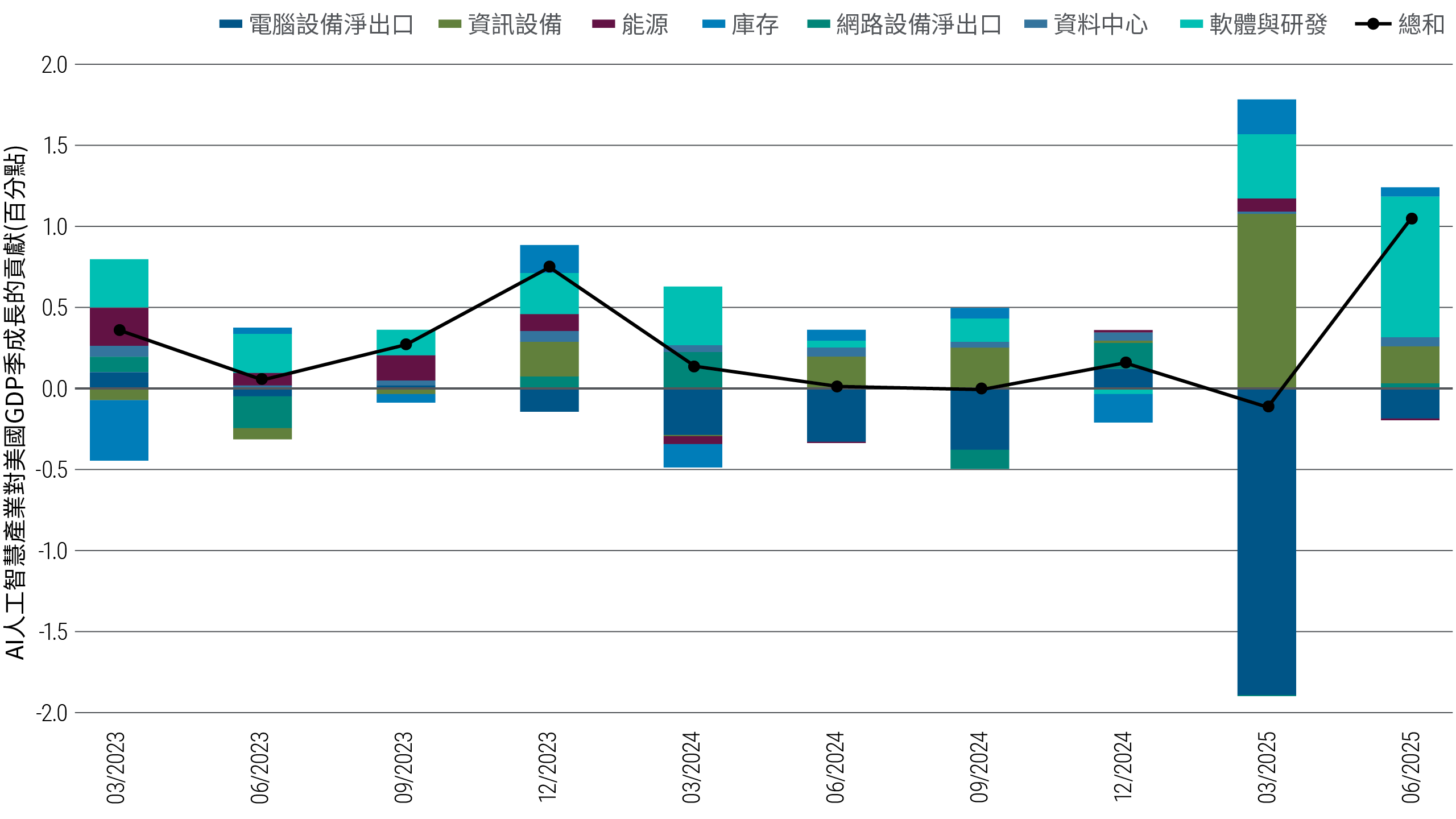 整體而言,AI人工智慧相關投資似乎為2025年美國整體投資成長貢獻了 1 個百分點。否則,美國投資趨勢原本應為停滯甚至收緊。若非伺服器與基礎設施相關組件為進口商品,AI人工智慧可能也為實質GDP成長貢獻了同樣幅度。