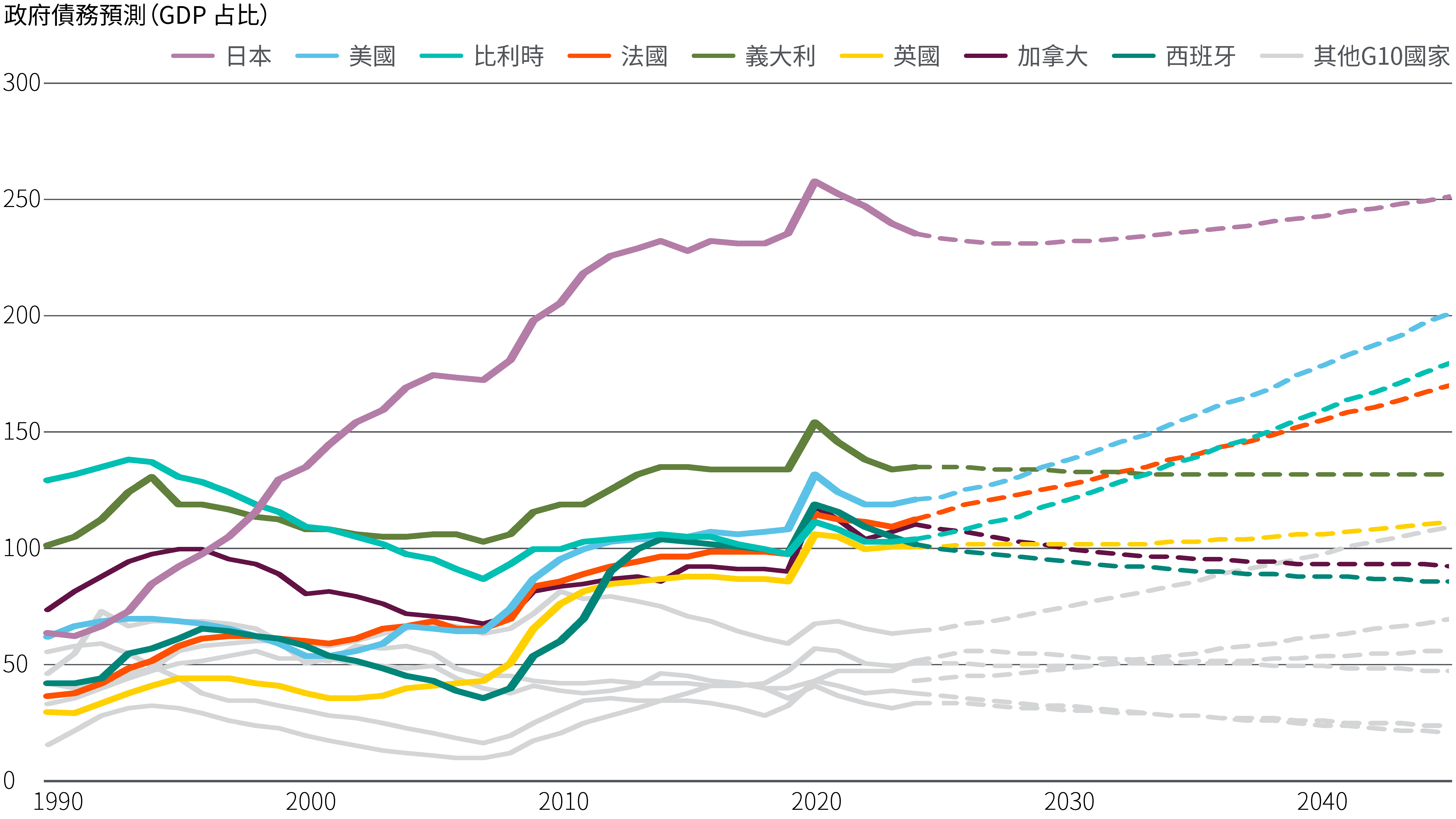 然而,這些問題看起來是慢性而非急性的。我們不預期會有突發的財政危機,而是可能出現階段性的市場波動,如2023年與2025年的美國,以及2022年更為劇烈的英國。我們的基期預測是,受益於美元其儲備貨幣的地位,美國公債仍是主權債券市場中「最乾淨的髒襯衫」。