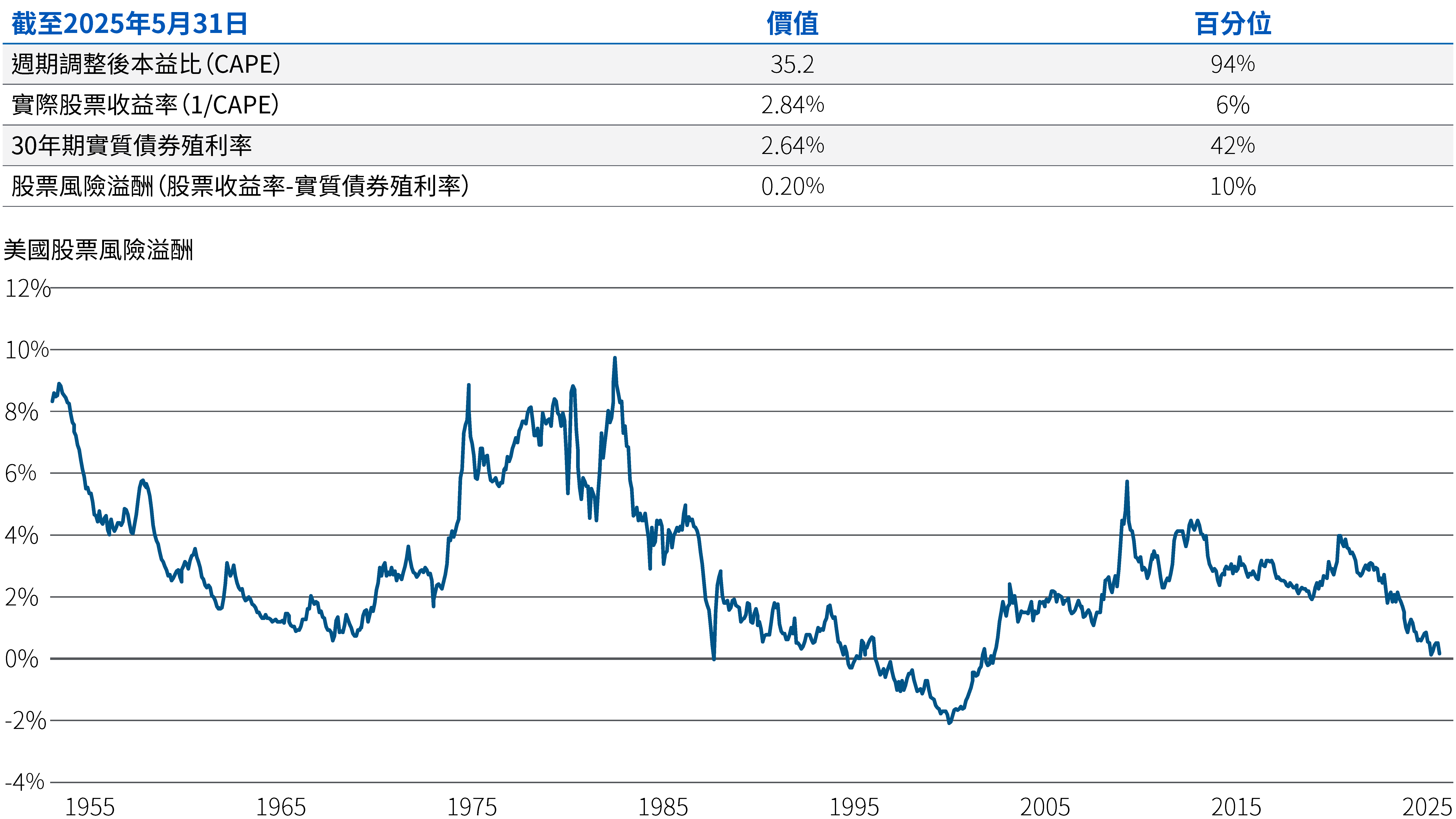 股票風險溢酬(即股票盈餘收益率與債券殖利率之間的差額)可能是資產配置的一大要素,它衡量了股票和債券之間的相對價值。計算該溢酬最直接的方法是以週期調整後的盈餘收益率減去實質(經通膨調整後)的債券殖利率。圖2顯示,美國股票風險溢酬目前為零,正處歷史低點。