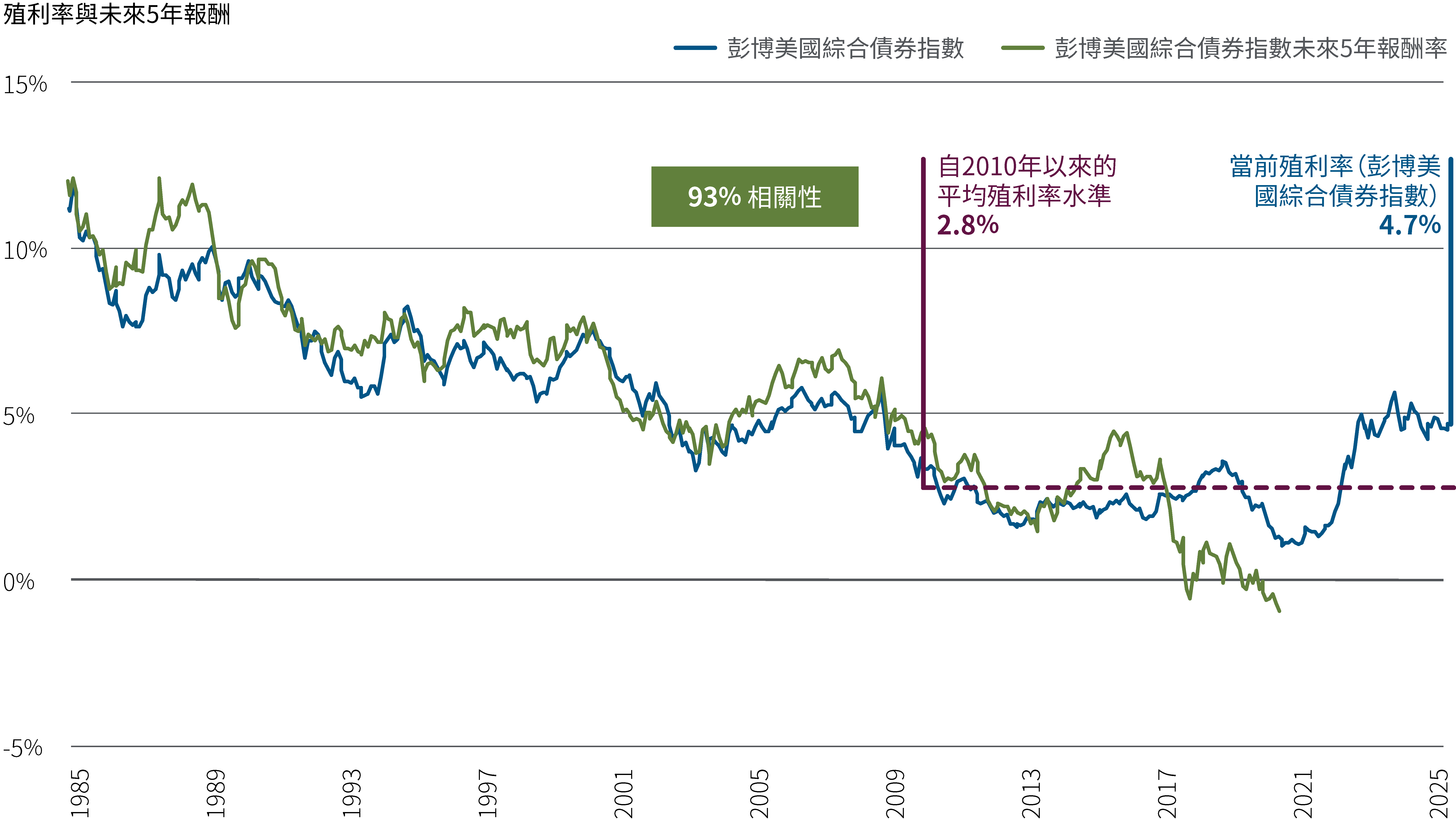 預測固定收益的報酬相對簡單:在長期展望期間內,債券投資組合的起始殖利率可以很好地反映預期報酬(見圖3)。截至2025年6月5日,用以衡量高品質債券常用的基準指標 - 彭博美國綜合債券指數和全球綜合債券指數(美元避險)的殖利率分別約為4.74%和4.94%。