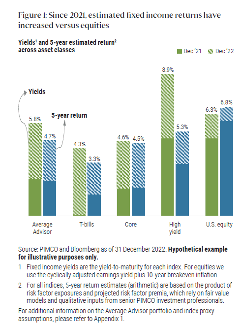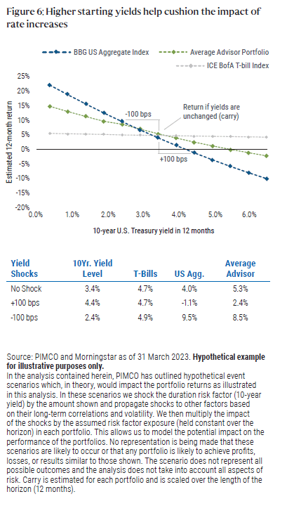 Starting yields across most fixed income sectors are at their highest levels in more than a decade following interest rate hikes in 2022. As we highlighted last year, future returns for bonds have historically followed starting yields in both duration- and credit-sensitive sectors. Figure 1 shows that the yield of the average advisor portfolio more than doubled in 2022, to 5.8% from 2.3%. According to PIMCO’s five- year annualized capital market assumptions, fixed income’s potential to drive returns in diversified portfolios is as compelling as it has been in over a decade.