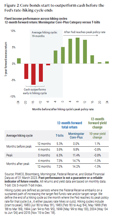 Over the typical 19-month hiking cycle (cycles have ranged from 12 months to 38 months since 1980), rates initially rise and core fixed income underperforms cash, as happened in 2022 when the Fed began aggressively raising rates. However, before the Fed reaches its peak policy rate (i.e., before it pauses or cuts), intermediate yields begin to fall on average and core fixed income allocations start to meaningfully outperform cash. While cash can mitigate downside risk as markets digest future rate hikes, the time to step out of cash typically comes as the Fed approaches its peak policy rate. As of the date of this publication, we believe the Fed may soon pause its hikes as it evaluates the path of inflation. With yields near decade highs, core fixed income strategies once again may be poised to outperform cash albeit with additional risk.