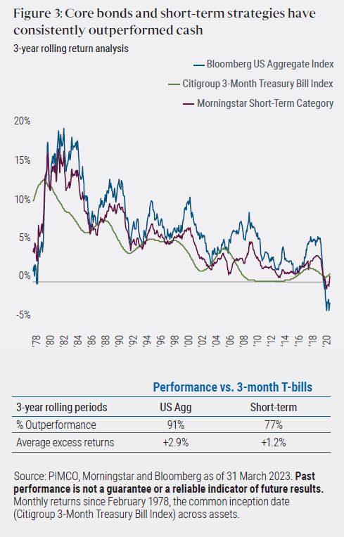 Another consideration when evaluating the trade-off between core and cash allocations is a client’s time horizon. Over the minimum horizon of most clients’ long-term investments (three years or more), core bonds have typically outperformed cash. As we show in Figure 3, core bonds have beaten cash 91% of the time over rolling three-year periods since 1978, with an average outperformance of 2.9%. Similarly, strategies in the Morningstar Short-Term Category have also demonstrated outperformance over most periods. Therefore, for most investors with reasonably long investment horizons, elevated cash allocations should be considered a short-term decision given the long-term potential advantages of remaining invested in high quality fixed income.