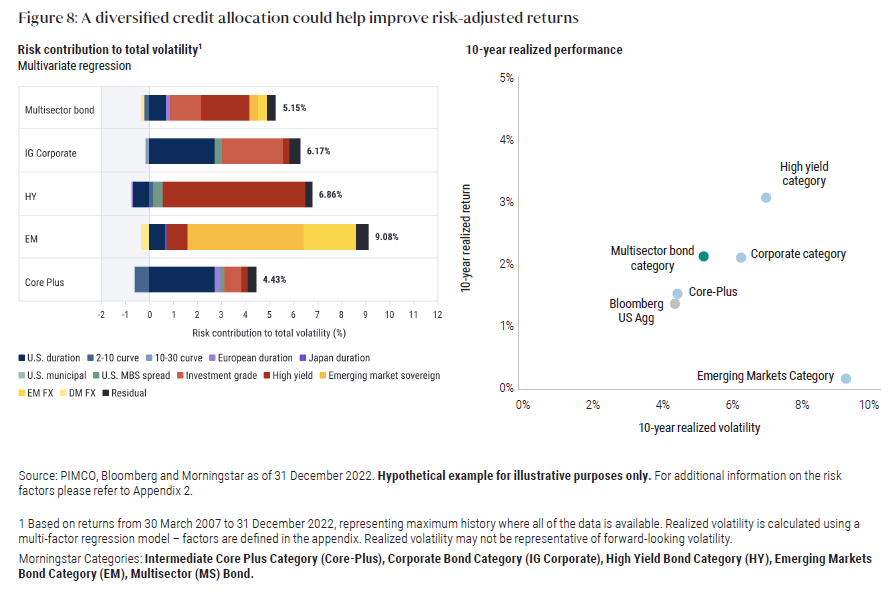 An often overlooked consideration is that credit can refer to a number of sectors– such as investment grade corporate credit, high yield corporate credit, securitized credit, municipal credit and emerging markets credit – which can behave quite differently across environments. A diversified credit allocation could help improve risk-adjusted returns, as shown in Figure 8. But as we discussed in "Bonds Are Different,” an active approach in fixed income may be able to provide superior outcomes. The Morningstar Multisector Bond Category had the best risk-adjusted returns of any individual credit sector category, and some funds within that category, have even outperformed the high yield category with lower volatility than investment grade credit strategies. These higher risk-adjusted returns partly reflect the improved risk management benefits of a diversified approach.