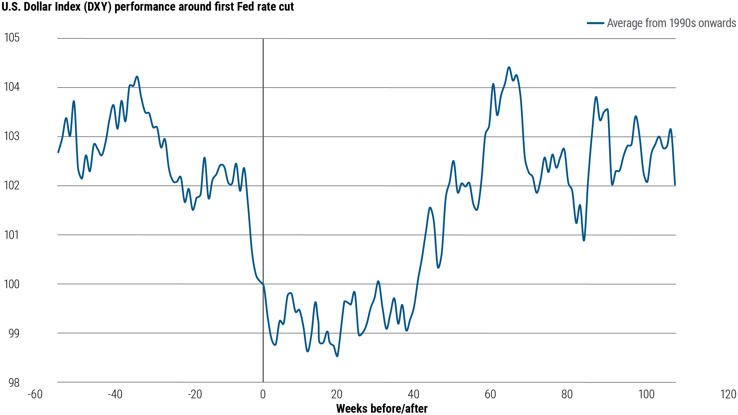 The dollar has tended to decline, at least temporarily. In past easing cycles, comprising both hard and soft landings, the U.S. dollar on average has tended to fall but then recover in the months following initial cuts (see Figure 3). We see the possibility of the dollar losing its status as a high-yielding currency as policy normalizes, with potential for moderate dollar depreciation.