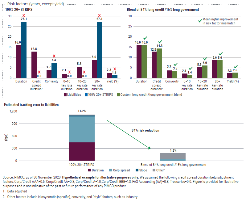 - May allow for a more robust hedge that aligns the portfolio with each liability risk factor (duration, credit, curve, etc.) as opposed to overemphasizing one factor at the expense of others.