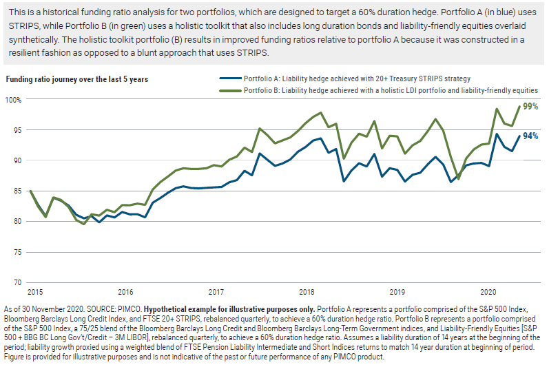 - Ability to maintain capital efficiency in line (or better than) STRIPS through the use of duration overlays paired with a more robust LDI portfolio.