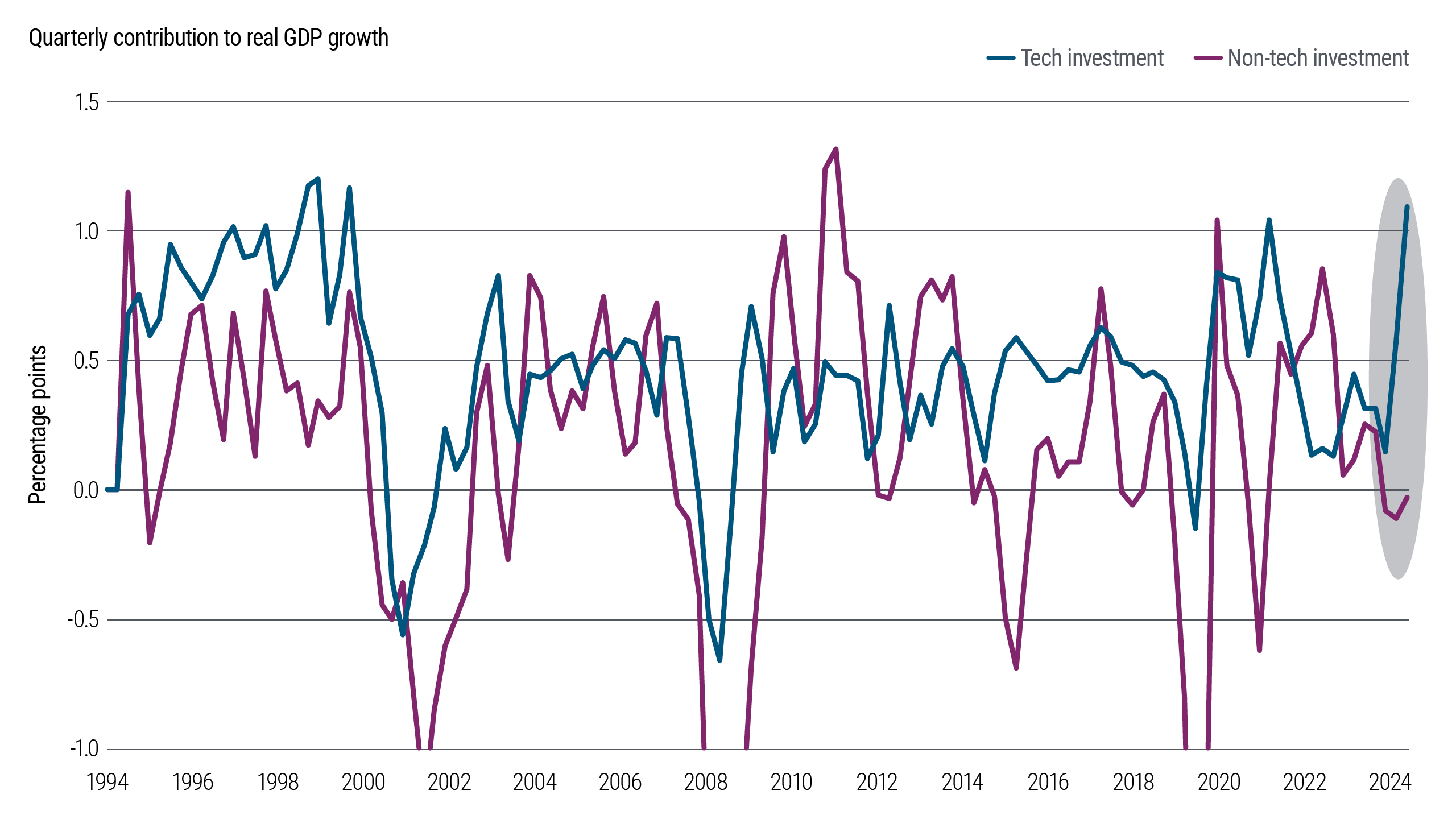 Global data trends point to a weaker period ahead before targeted fiscal stimulus in some regions starts to kick in. At the same time, resilient tech investment, especially in the U.S. and China, is poised to continue, with potentially growing effects on productivity and the labor market.