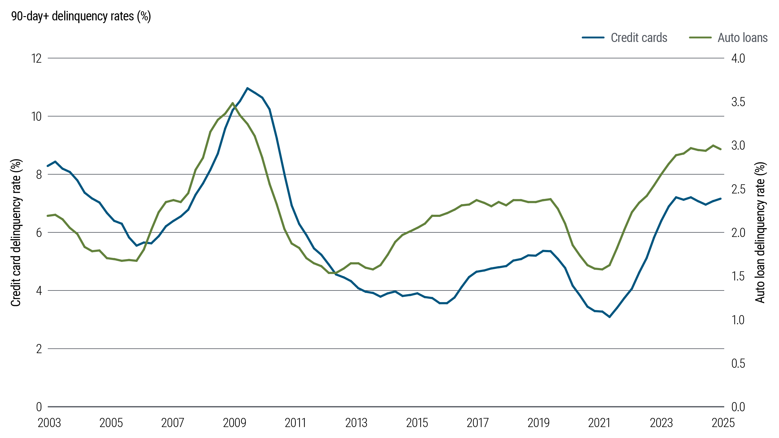 Figure 4: Credit card and auto loan delinquencies are near two-decade highs
