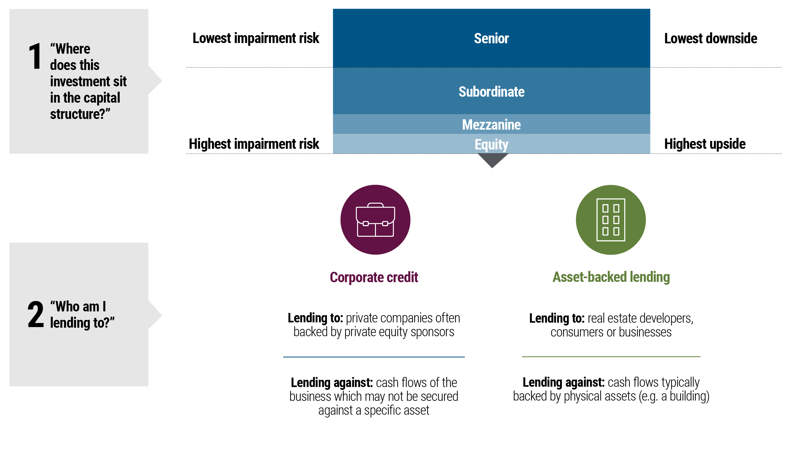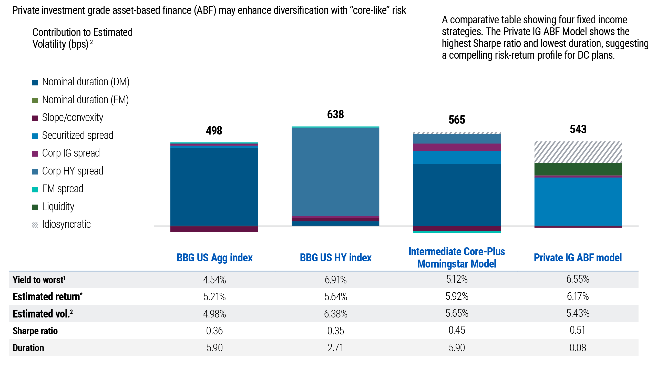 A word about risk: All investments contain risk and may lose value. Investing in the bond market is subject to risks, including market, interest rate, issuer, credit, inflation risk, and liquidity risk. The value of most bonds and bond strategies are impacted by changes in interest rates. Bonds and bond strategies with longer durations tend to be more sensitive and volatile than those with shorter durations; bond prices generally fall as interest rates rise, and low interest rate environments increase this risk. Reductions in bond counterparty capacity may contribute to decreased market liquidity and increased price volatility. Bond investments may be worth more or less than the original cost when redeemed. Investments in asset-based lending and asset-backed instruments are subject to a variety of risks that may adversely affect the performance and value of the investment. These risks include, but are not limited to, credit risk, liquidity risk, interest rate risk, operational risk, structural risk, sponsor risk, monoline wrapper risk, and other legal risks. Asset-backed securities across various asset classes may not achieve business objectives or generate returns, and their performance can be significantly impacted by fluctuations in interest rates. Investments in residential and commercial mortgage loans, as well as commercial real estate debt, are subject to risks that include prepayment, delinquency, foreclosure, risks of loss, servicing risks, and adverse regulatory developments. These risks may be heightened in the case of non-performing loans. Investments in mortgage and asset-backed securities are highly complex instruments that may be sensitive to changes in interest rates and are subject to early repayment risk. Structured products, such as collateralized debt obligations, are also highly complex instruments that typically involve a high degree of risk; the use of these instruments may involve derivative instruments that could result in losses exceeding the principal amount invested. Private credit involves investments in non-publicly traded securities, which may be subject to illiquidity risk. Portfolios that invest in private credit may be leveraged and may engage in speculative investment practices that increase the risk of investment loss. Additionally, investments in private credit may be subject to real estate-related risks, which include new regulatory or legislative developments, the attractiveness and location of properties, the financial condition of tenants, potential liability under environmental and other laws, as well as natural disasters and other factors beyond a manager’s control. Investing in banks and related entities is a highly complex field subject to extensive regulation, and investments in such entities may give rise to control person liability and other risks. Investing in distressed loans and bankrupt companies is speculative, and the repayment of default obligations contains significant uncertainties. High-yield, lower-rated securities involve greater risk than higherrated securities; portfolios that invest in them may be subject to greater levels of credit and liquidity risk than portfolios that do not. Collateralized Loan Obligations (CLOs) may involve a high degree of risk and are intended for sale to qualified investors only. Investors may lose some or all of their investment, and there may be periods during which no cash flow distributions are received. These investments are exposed to risks such as credit, default, liquidity, management, volatility, interest rate, and credit risk. Diversification does not ensure against loss. The use of leverage may cause a portfolio to liquidate positions when it may not be advantageous to do so to satisfy its obligations or to meet segregation requirements. Leverage, including borrowing, may cause a portfolio to be more volatile than if the portfolio had not been leveraged. Management risk is the risk that the investment techniques and risk analyses applied by an investment manager will not produce the desired results, and that certain policies or developments may affect the investment techniques available to the manager in connection with managing the strategy.