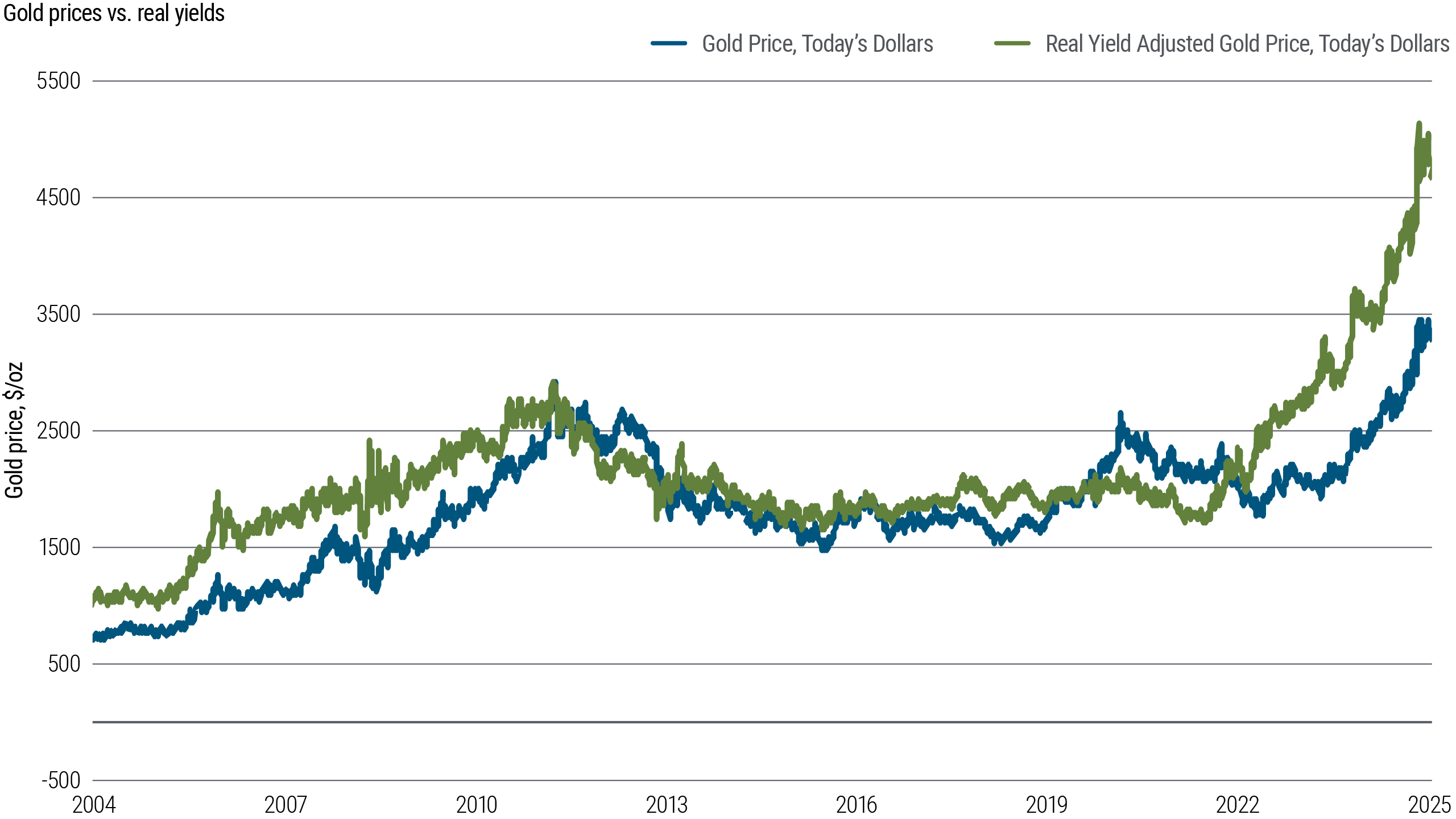 Similarly, the “safe haven” bid for gold has not only been evident, but more prevalent in recent years. For example, in early 2022 gold prices jumped amid Russia’s invasion of Ukraine, despite real yields increasing. Since then, we have seen an unprecedented increase in global central banks’ gold purchases driven in part by an effort to de-dollarize and repatriate their reserves. We have also seen an increase in retail demand, as evidenced by rising ETF flows, especially following the 2024 U.S. election cycle. This “sticky” safe haven buying contributed to a run-up in gold prices, which reached all-time highs in early 2025, decoupling the link between prices and real yields for the time being.